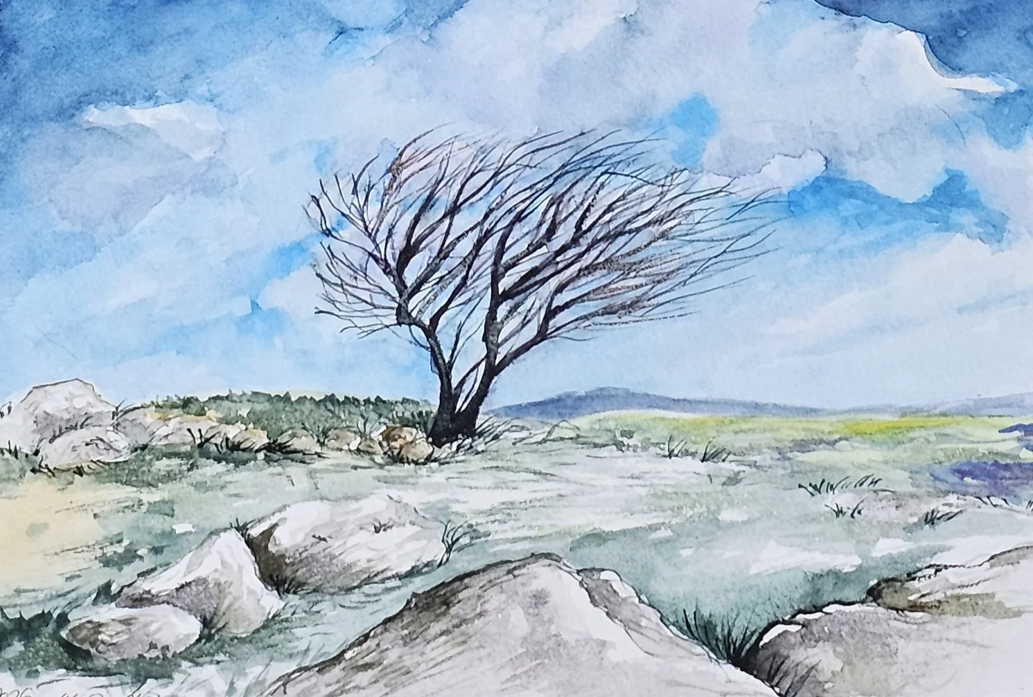 A Meditative Moment. This work evokes a still, inward-looking atmosphere within the wide-open landscape. The treeโs sway in the breeze harmonizes with the ethereal, translucent washes of the sky, stirring a feeling of soft tranquility and restful contemplation