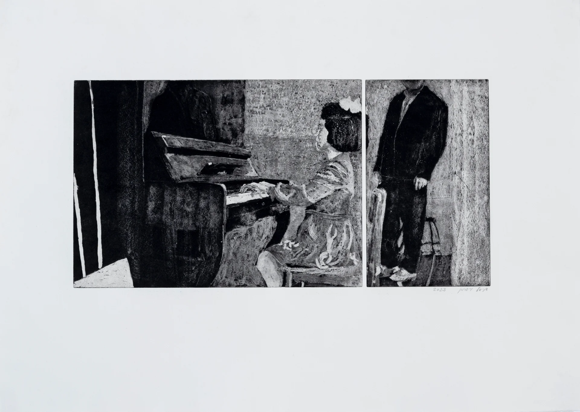 העבודה מתארת בת המנגנת בפסנתר, ולצידה אביה העומד ומתבונן בה. החלוקה לשני חלקים מדגישה את הקשר ביניהם, רגע אינטימי של נוכחות שקטה, תמיכה ומבט הורי המלווה את הצליל