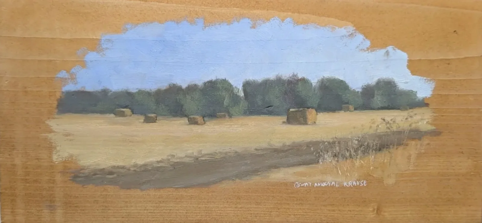 A pastoral landscape painting depicting hay bales scattered across the fields of Nachshon in the morning light. Painted with an impressionist sensibility, the work revisits a beloved agricultural setting that embodies diligence, persistence, and abundance, using warm earthy tones and expressive brushwork.