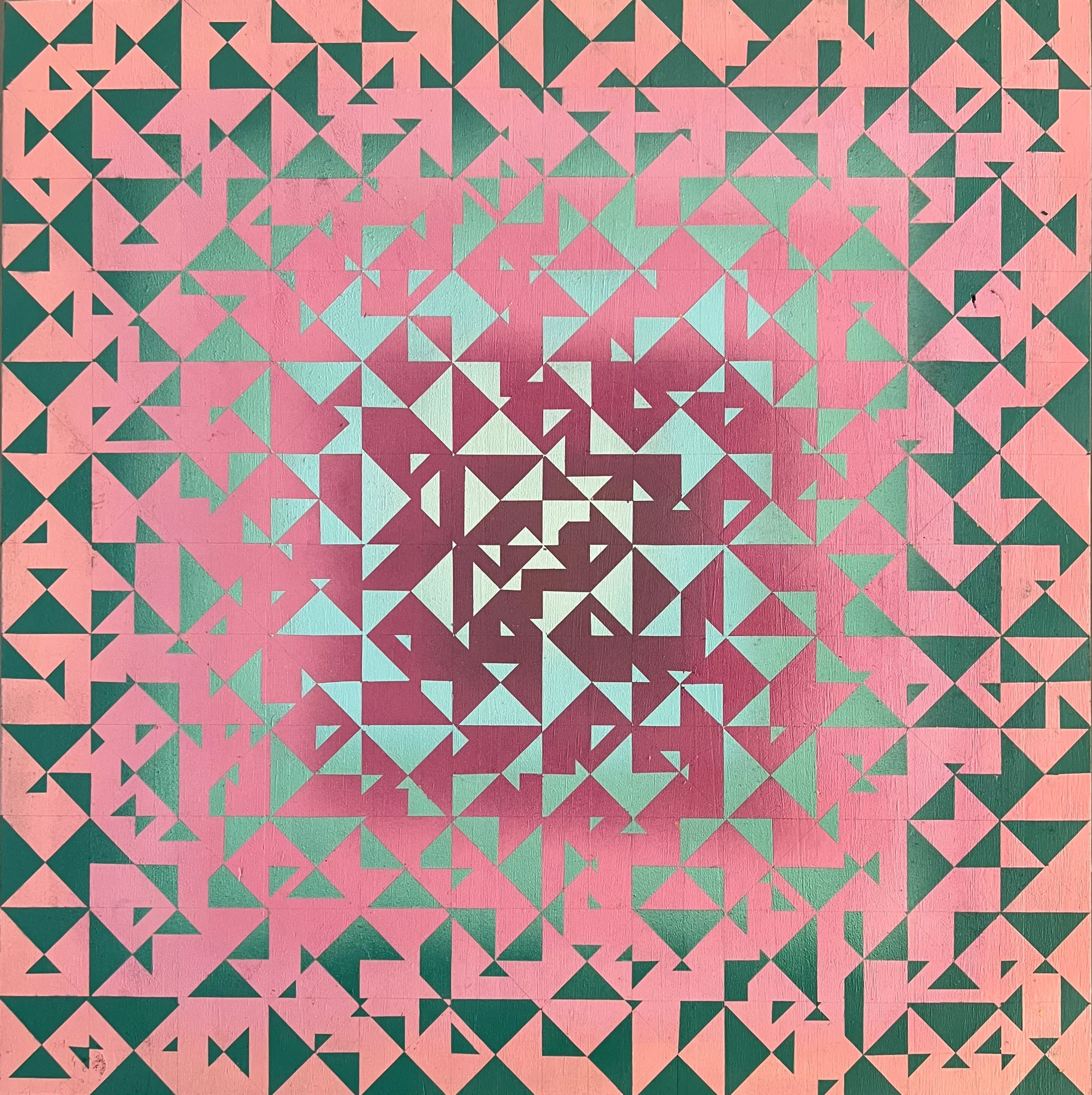 Set against a backdrop of soft pinks fading into antique rose, a geometric constellation of triangles unfolds in deep turquoise, gradually dissolving into delicate sky blue, almost white. The contrast evokes a surge of energy, the gaze is drawn inward to the point of origin, then bursts outward like a cosmic shatter of light and glass across the atmosphere. This transition from darkness to brightness embodies the tension between order and chaos, light and shadow, while creating the illusion of infinite expansion within a fractured sky.