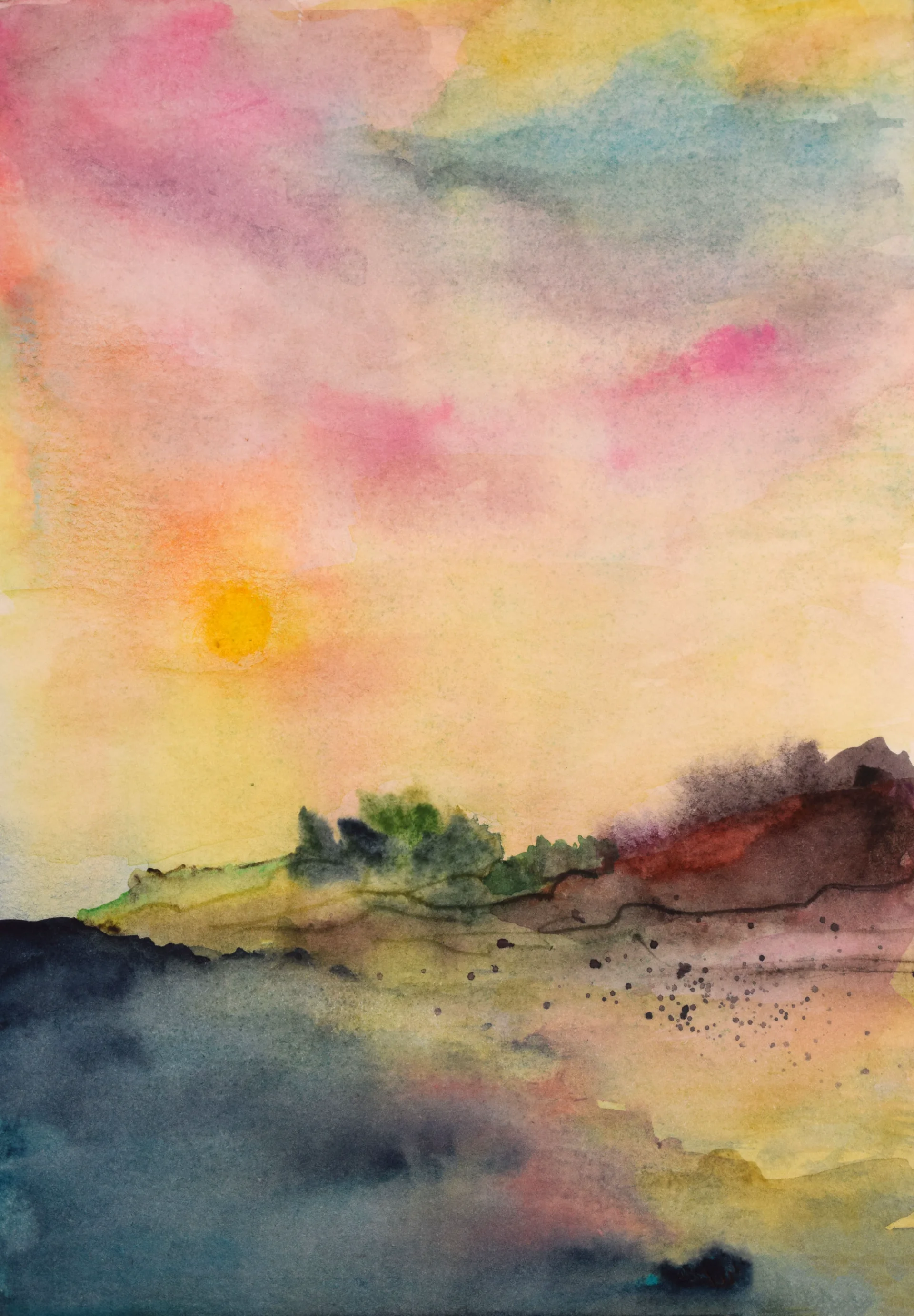 A seashore painted in pastel colors at sunset, a watercolor painting