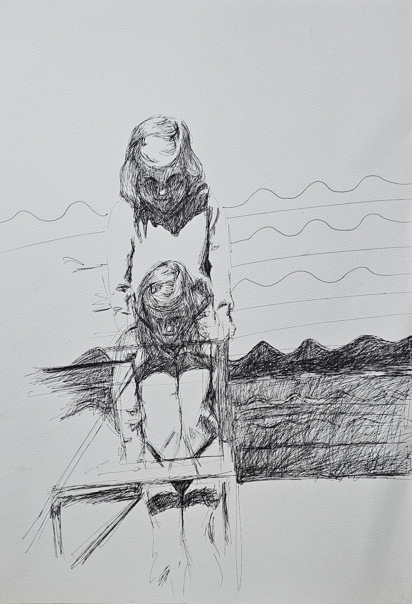Dual Motion. An expressive pen drawing depicting a girl appearing twice within a single frame, through a combination of layered and bold lines. A piece that captures fleeting time and the girl's personal connection to the playground and to herself
