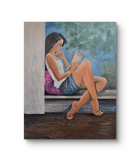 An original and delicate painting that immortalizes an intimate moment of peace and inner gathering. A young figure sits next to an open window to nature, immersed in reading a book and illuminated by soft light penetrating through the trees. The combination of the cool colors of the background with the warm skin tones creates an exciting balance between the external world and the inner world of the figure. The purple pillow adds a lively and modern touch to the elegant composition. A work full of emotion, femininity and calm, suitable for bringing an atmosphere of inspiration, dream and peace into the home.