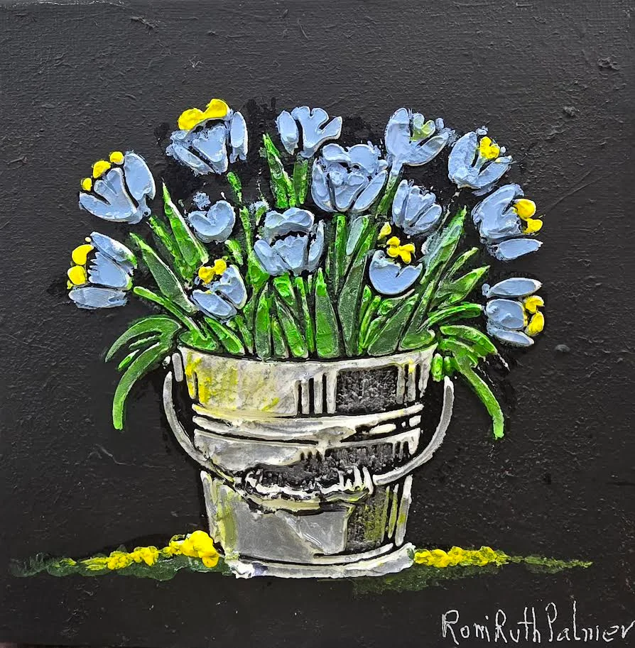 Original mixed media work A small, expressive painting that combines tenderness, color, and textural depth in perfect harmony. A bouquet of flowers in delicate shades of light blue and golden yellow blooms from a white vintage bucket, against a dark, powerful background that emphasizes the light and life in the composition. The mixed media work creates rich layers and a tangible, almost sculptural relief that gives the work depth and interest from every angle. The free brushstrokes and color accents give a sense of naturalness and freshness, as if the flowers were just picked from a quiet country garden. Despite its small size, the painting radiates warmth, optimism, and a touch of rural nostalgia. It is perfect for an intimate corner of the home, a special shelf, or as a meaningful artistic gift. This is an original, one-of-a-kind piece โ a small treat with a big presence. ๐ฟโจ