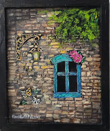 An original and magical mixed media painting depicting an ancient stone wall with a turquoise window full of life and hope. Next to the window is a nostalgic lantern, pink flowers blooming above it and delicate butterflies dancing around it – all adding a touch of joy and tenderness to the rough stone texture. The work combines depth, color and rich texture, and conveys the feeling of a hidden European alley where time stands still for a moment. A painting small in size but large in the atmosphere it gives – perfect for an intimate corner in the home, office or as a special gift for lovers of original art.