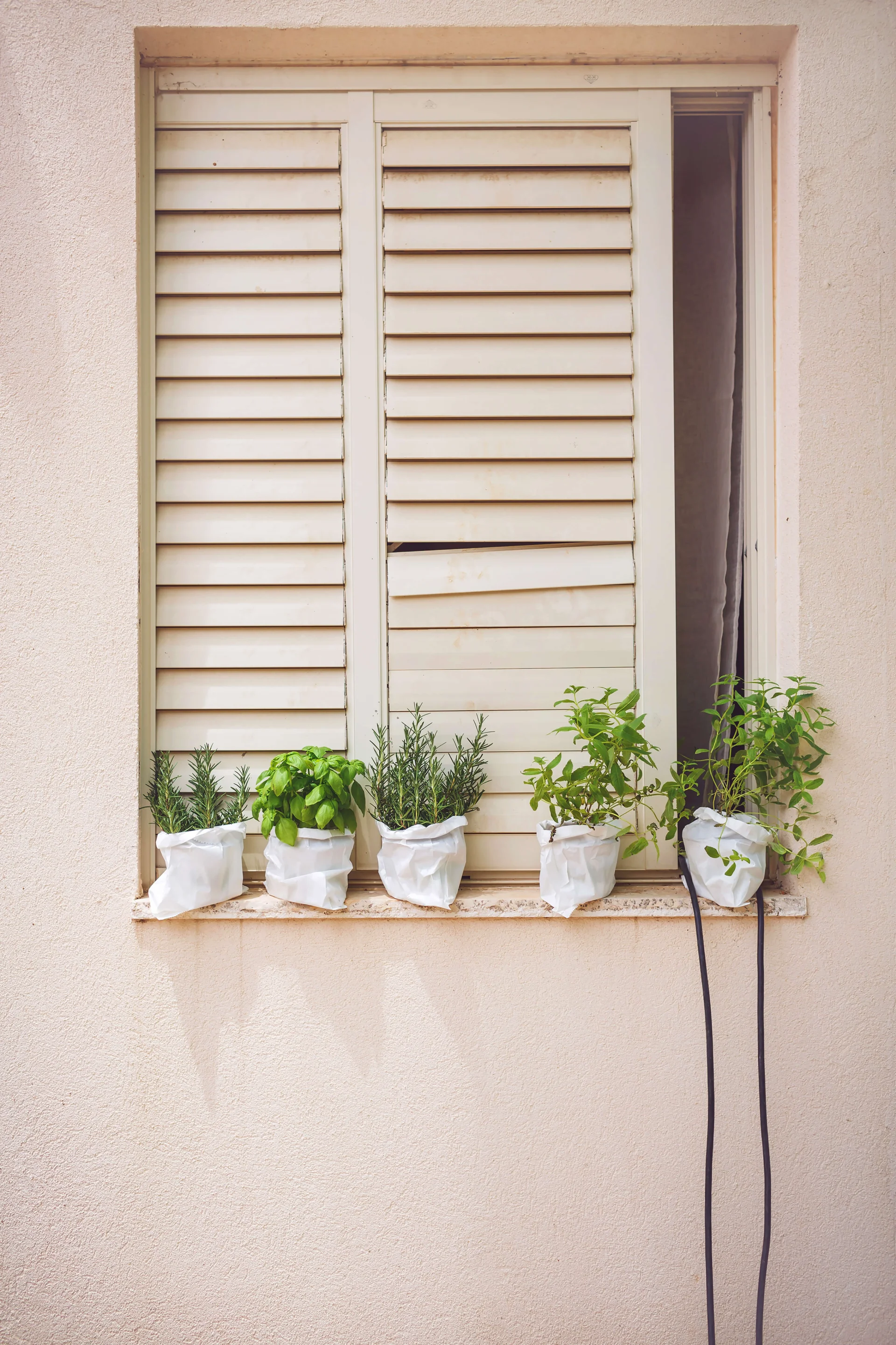 A window, with old dented blinds and spice plants on the ledge