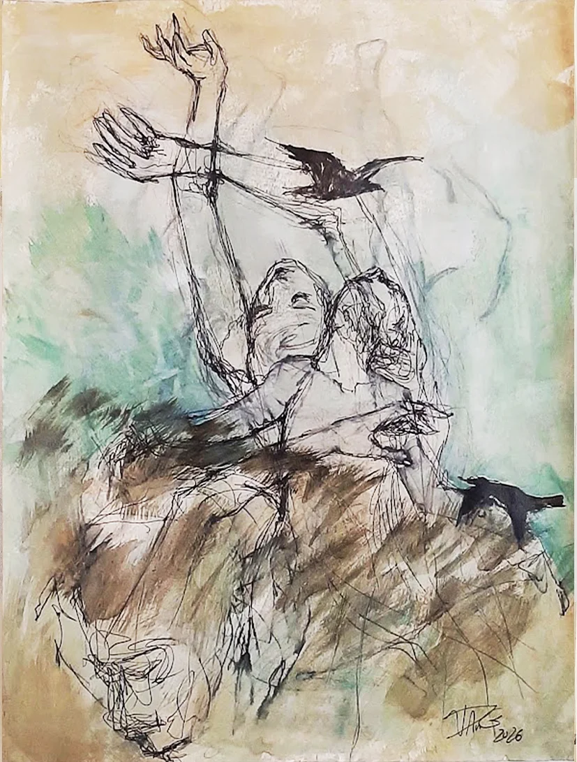A figurative painting in cool tones of brown and light blue, featuring figures drawn in black ink that intertwine with one another. The composition suggests an abstract dance in an open field- a shared movement that remains deeply internal. Each figure is immersed in its own moment, present within a personal inner world. The sense of solitude that emerges is not threatening or lonely, but rather full and calming- a space that allows both the figures and the viewer to connect with their own sense of aloneness, to extend their arms within an open landscape and surrender to their inner world. The painting presents solitude not as separation, but as a quiet form of connection where one’s own presence is enough, and even expansive.