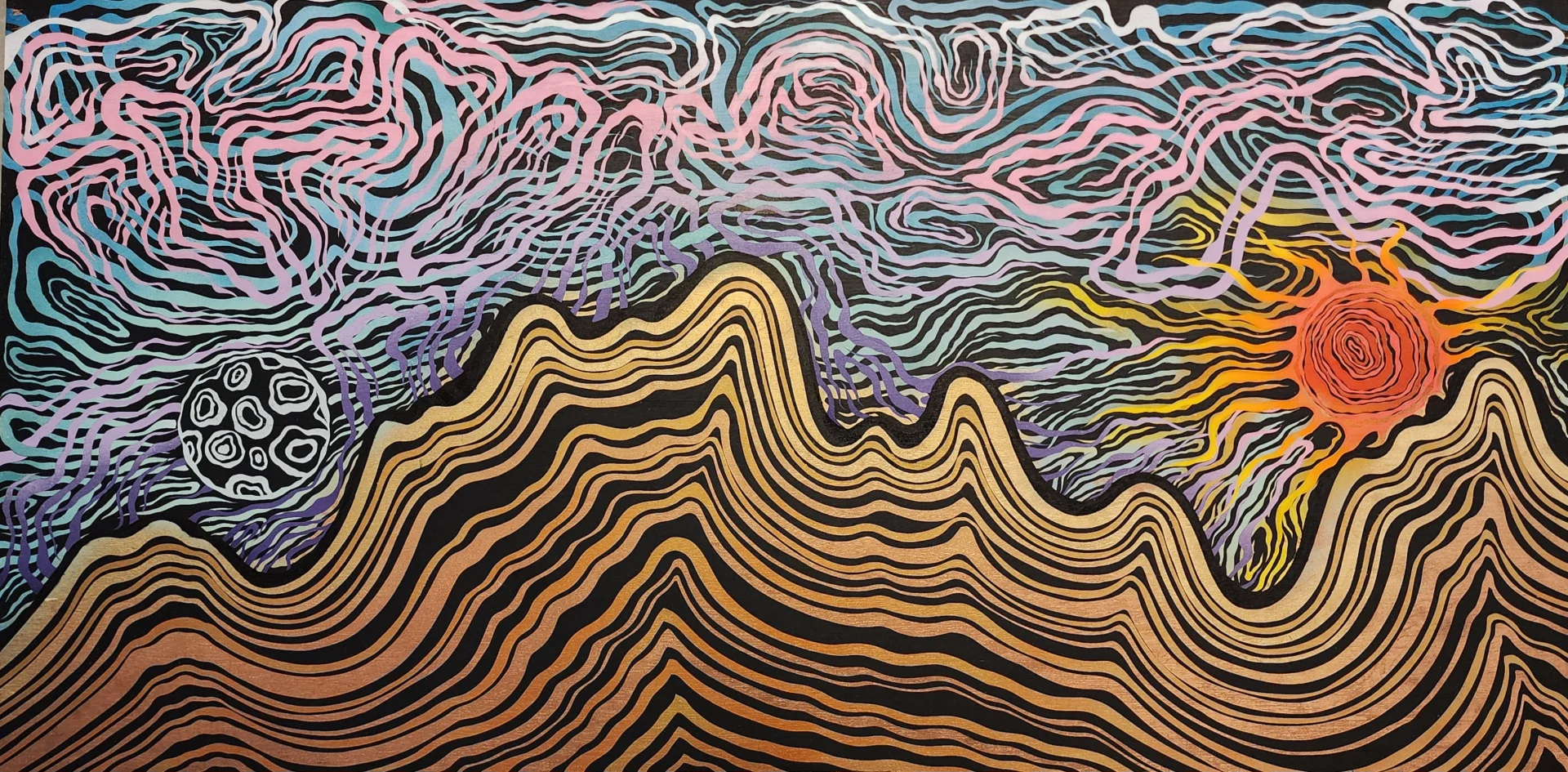 A cosmic flow of undulating lines and golden strata collides with a vivid night sky. A blazing sun and a mysterious celestial body hover above a hypnotic topographic landscape, evoking motion between earth and space. Created using the Unmaskit technique hand-cut masking, layered reveals, and precise spray painting that expose depth, rhythm, and breath in every line.