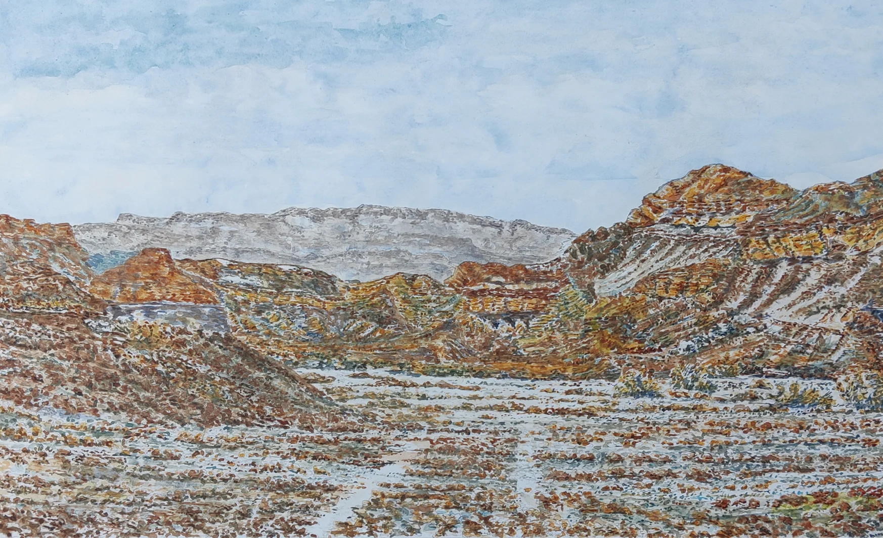 Watercolor painting on paper of the entrance to Nahal Peretzim, a stream that winds through bright marl and chalk rocks in the Judean Desert on its way to the Dead Sea.