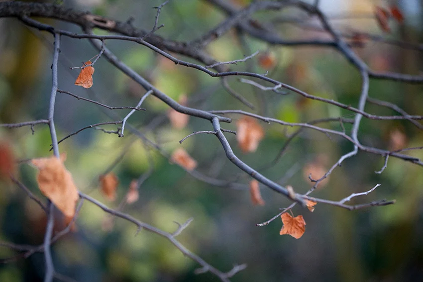 A branch with orange autumn leaves stands gently against a softly blurred background of green plants. The interplay of colors and the soft focus create a delicate, harmonious image.