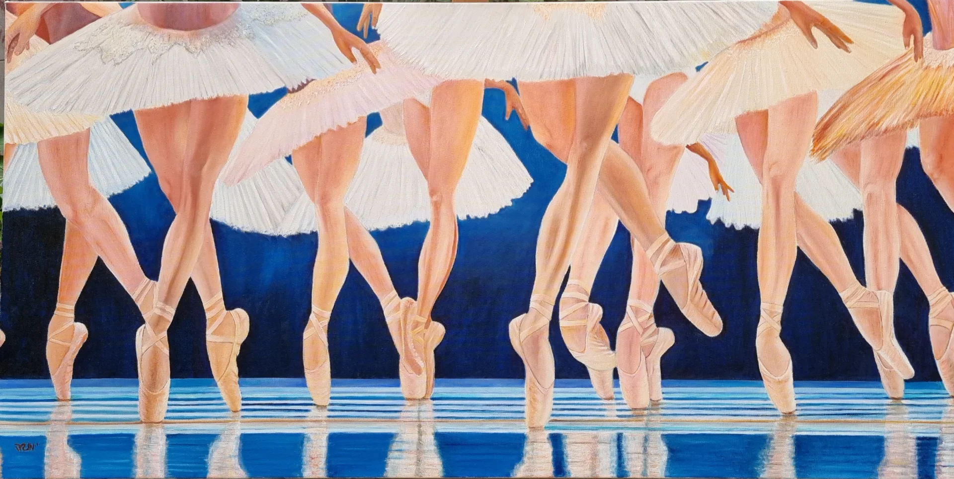 An original oil painting on large canvas, capturing the spectacular moments on the ballet stage. The painting forgoes the face in favor of focusing on the dancers' legs, pointe shoes, and puffy tutus, making the figures a symbol of elegance and precision.