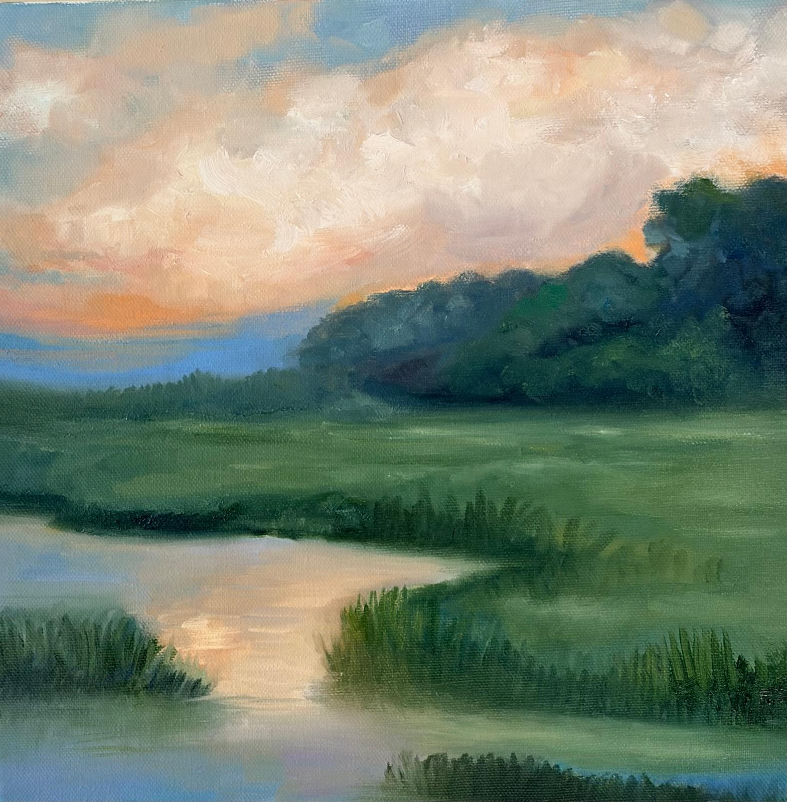 The painting depicts a natural landscape at sunrise before dawn . The sky is painted in soft shades of orange, peach, and light blue, as if the sun is just beginning to rise and illuminate the clouds with a warm, gentle light. In the painting, there is a river or a small lake reflecting the orange hues of the sky, adding a sense of calm and tranquility. Around the water, there is green vegetation, with soft brushstrokes suggesting grasses and shrubs. In the background, a wooded area or darker hills rise in deep shades of green and blue, creating a beautiful contrast with the bright light of the sunrise. The entire painting feels slightly blurred and soft, giving it a peaceful atmosphere