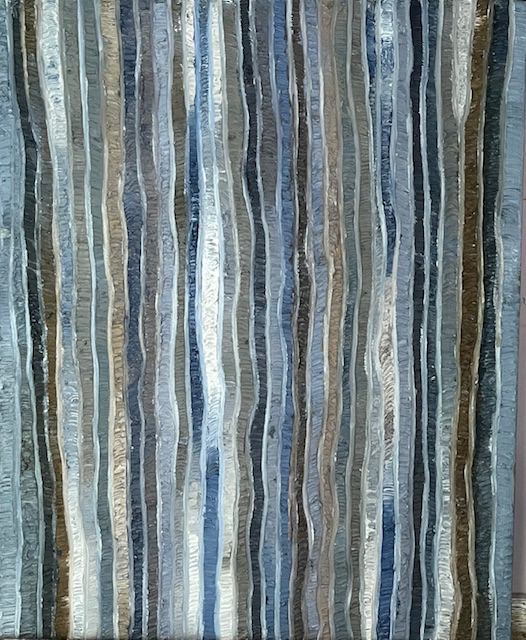 Original oil on canvas created with a process-based impasto technique. Vertical rhythmic layers in muted blue, grey, ivory, and earthy tones build a meditative abstract field that explores movement, repetition, and presence through richly textured surfaces.