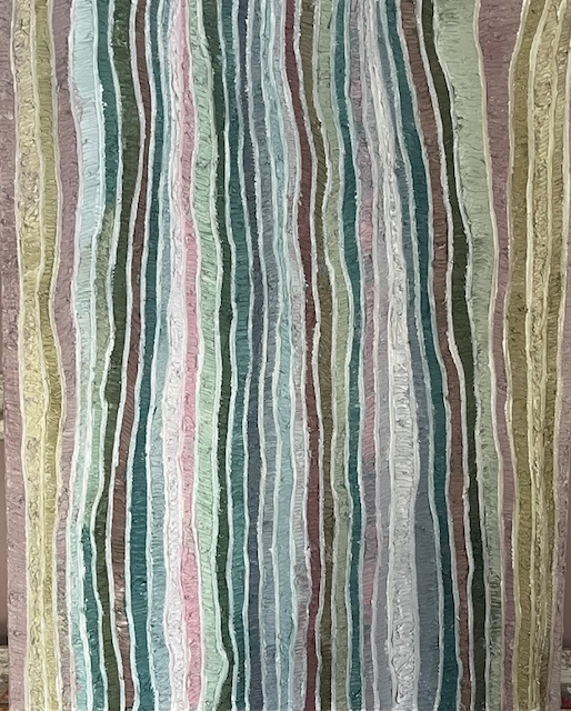 A textured impasto work from the 'Being' series, built through a process-based layering of vertical rhythmic lines in muted, organic tones. The composition explores pulse, repetition, and material presence, creating a contemplative abstract field with tactile depth.