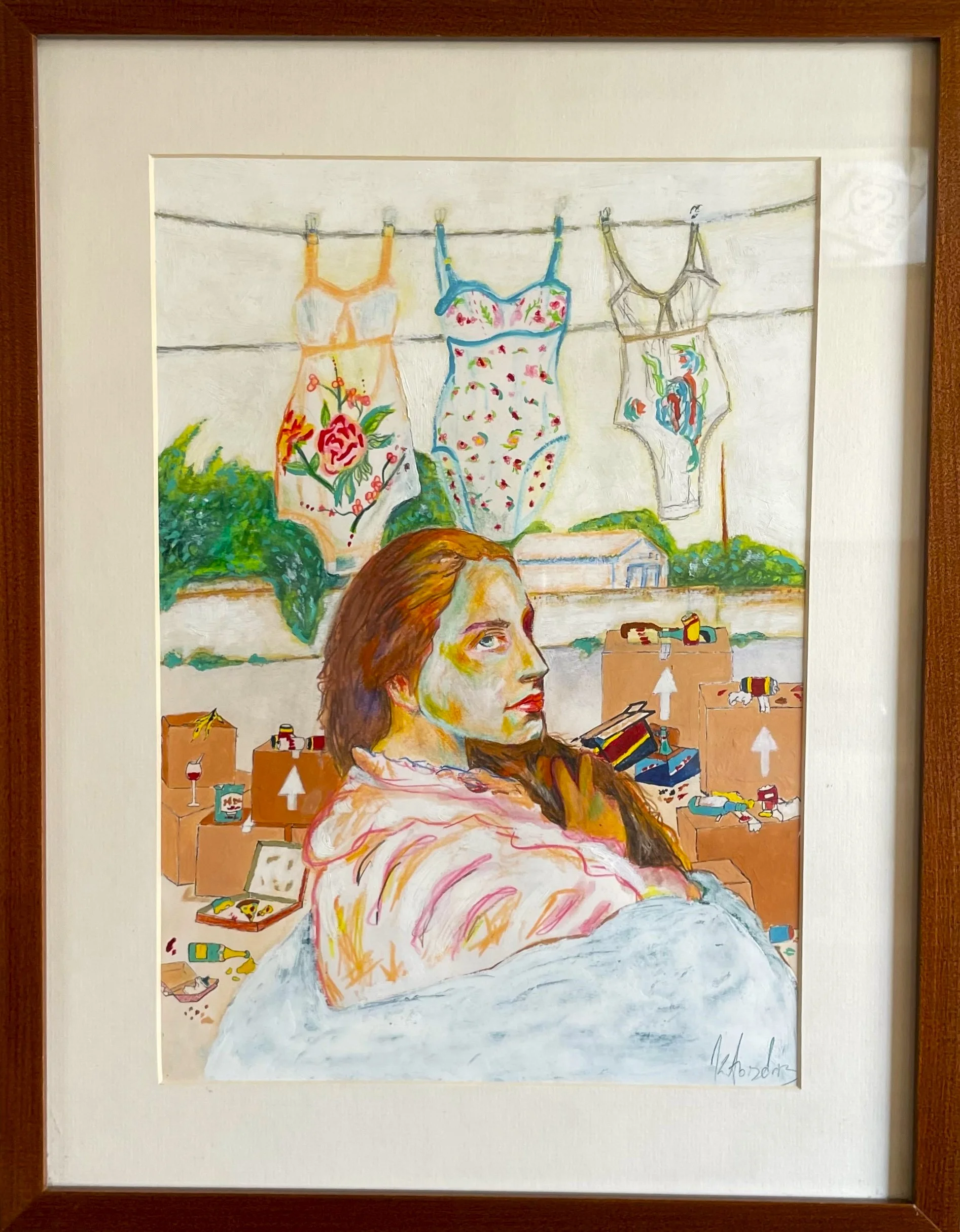 The artwork is sold framed in a wooden frame. Framed dimensions: 55 ร 43 cm. A female portrait set in a temporary space, suspended between the apartment being left behind and the one that does not yet exist. The figure looks back from within stacked moving boxes, fragments of dismantled domestic life, while floral bodysuits hang above her like traces of femininity, memory, and desire. The painting reflects on urban transience and the existential condition of living between apartments- between identities, roles, and forms of belonging. In this shifting reality, the body remains the only constant.
