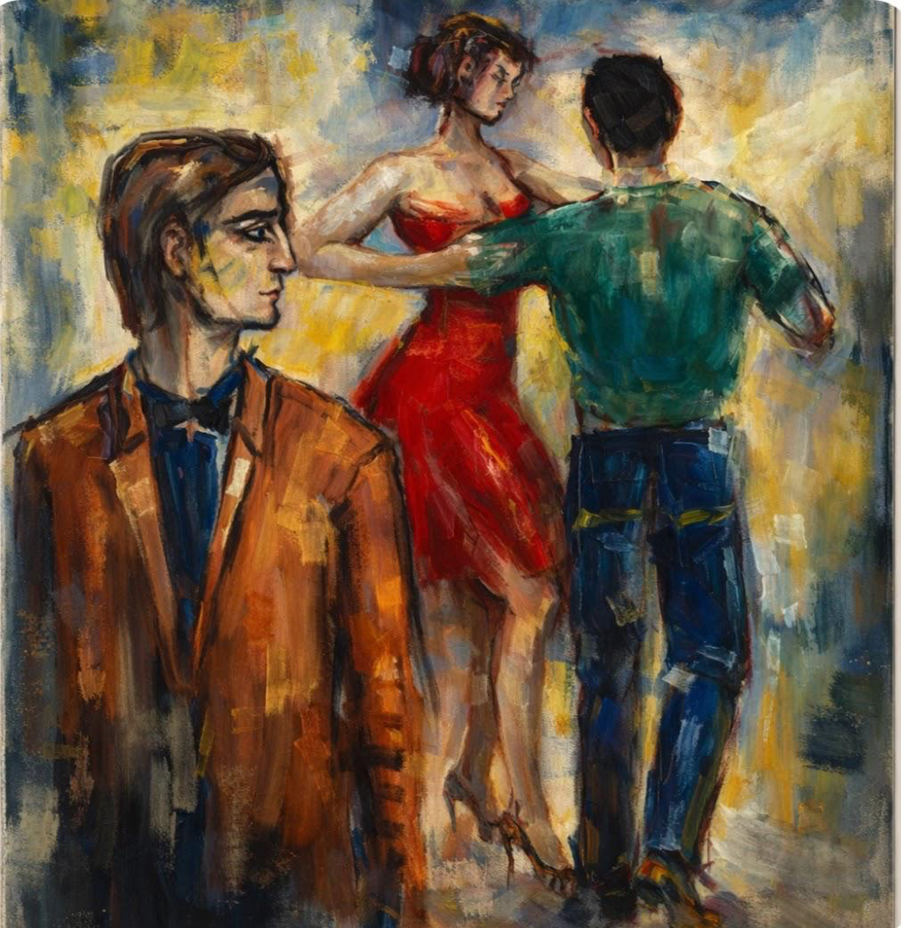 An expressive figurative oil painting on canvas depicting a charged moment between dancers and an observing figure. Loose, dynamic brushwork and a rich palette of warm reds, ochres, and cool blues create a sense of movement, theatricality, and emotional tension.