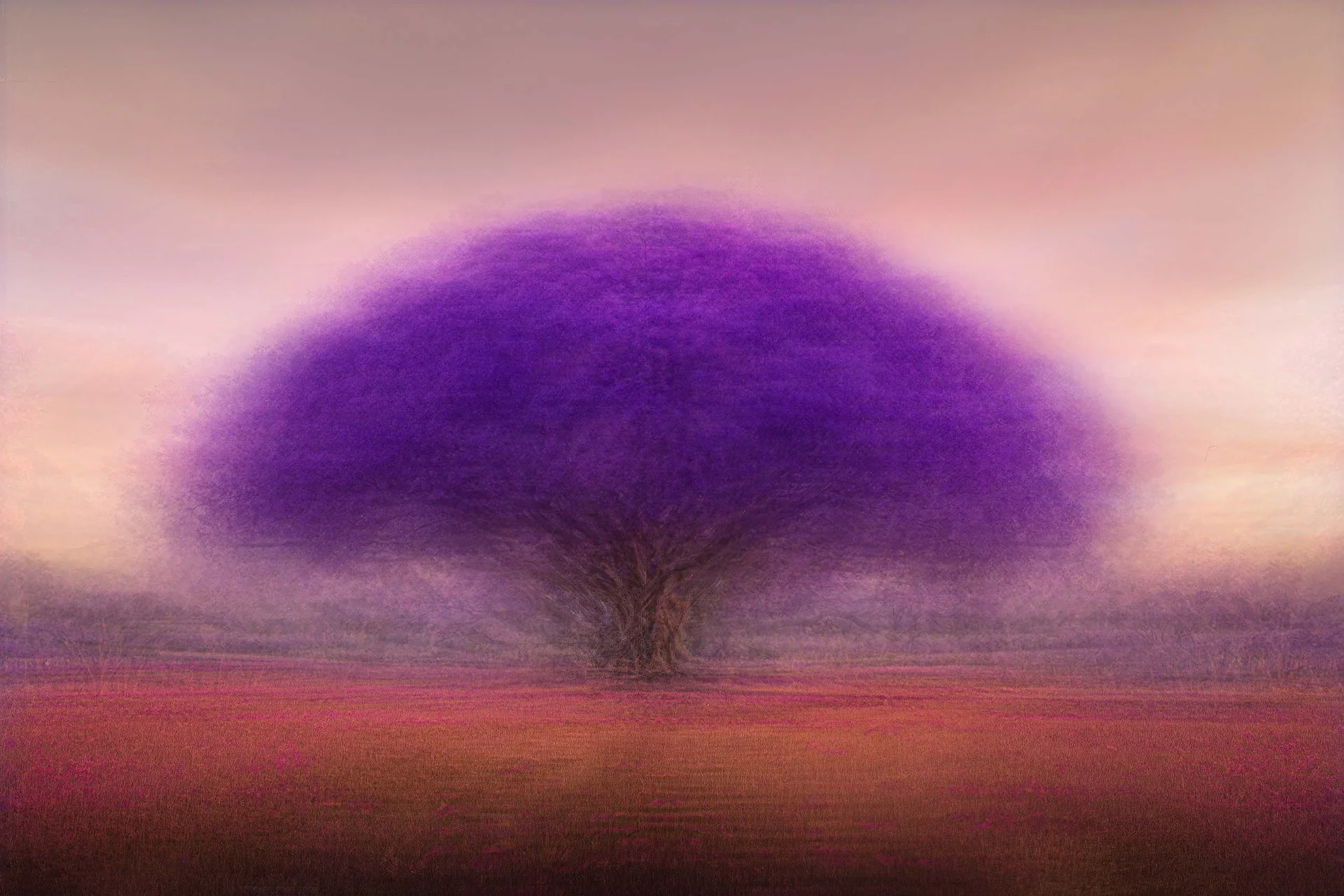 A work depicting a purple tree in full bloom, constructed from twenty layered exposures. The work combines photography with a painterly feel to create a composition rich in texture and color.