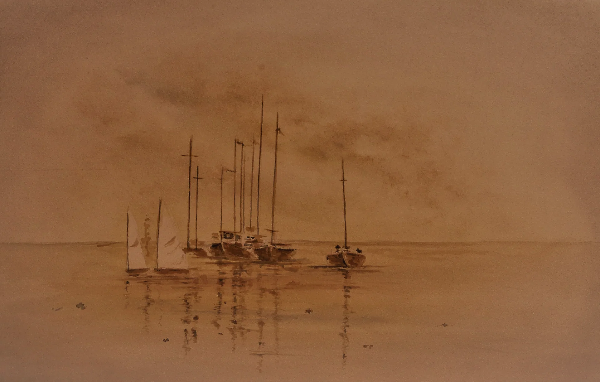 Watercolor painting on paper of boats in a very calm atmosphere in flat water.