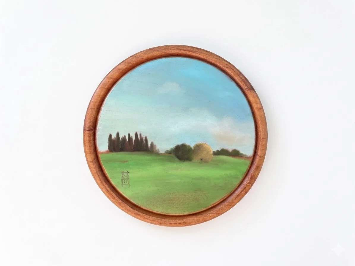 This is the field behind my house, a pair of oaks and a row of pines that take my breath away every day. Oil on a round cutting board.