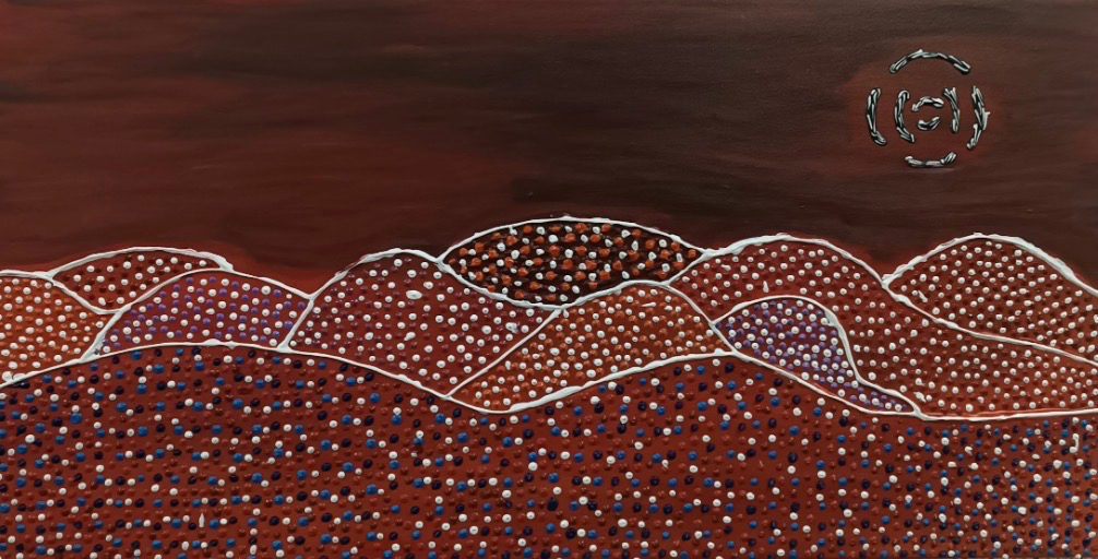 A contemporary desert landscape rendered in warm earthy tones, featuring layered hill forms and rhythmic dot work that evoke the breath, stillness, and spiritual resonance of the desert. The composition combines texture, repetition, and symbolic mark-making to create a meditative visual experience.