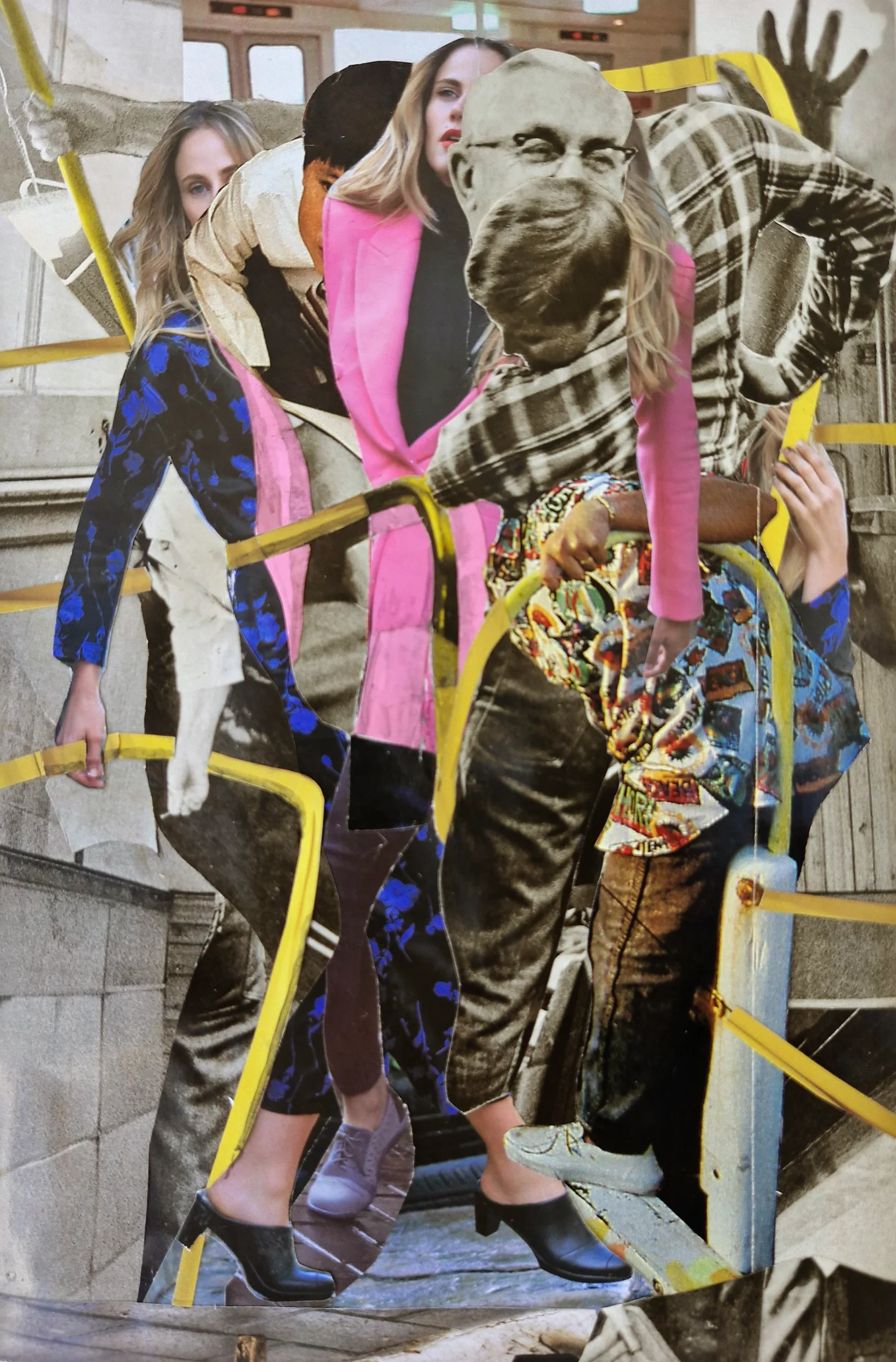 A dynamic collage capturing the energy and complexity of human interactions within an urban space.
