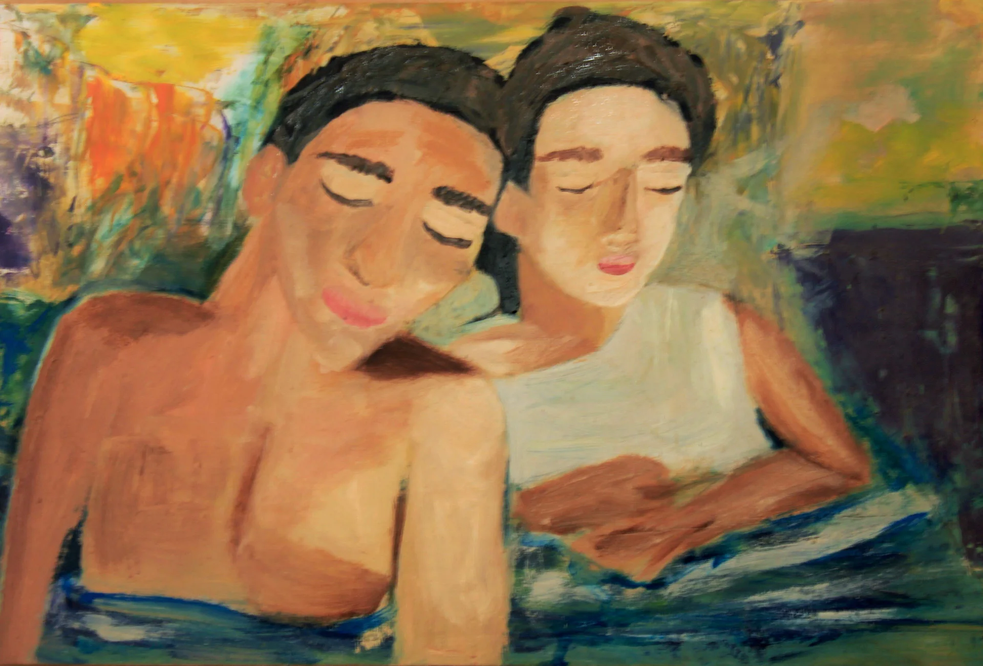 The painting documents a moment of brotherhood of brothers falling asleep together. The atmosphere is warm and intimate, the colors are intense and add expressive feeling to the painting
