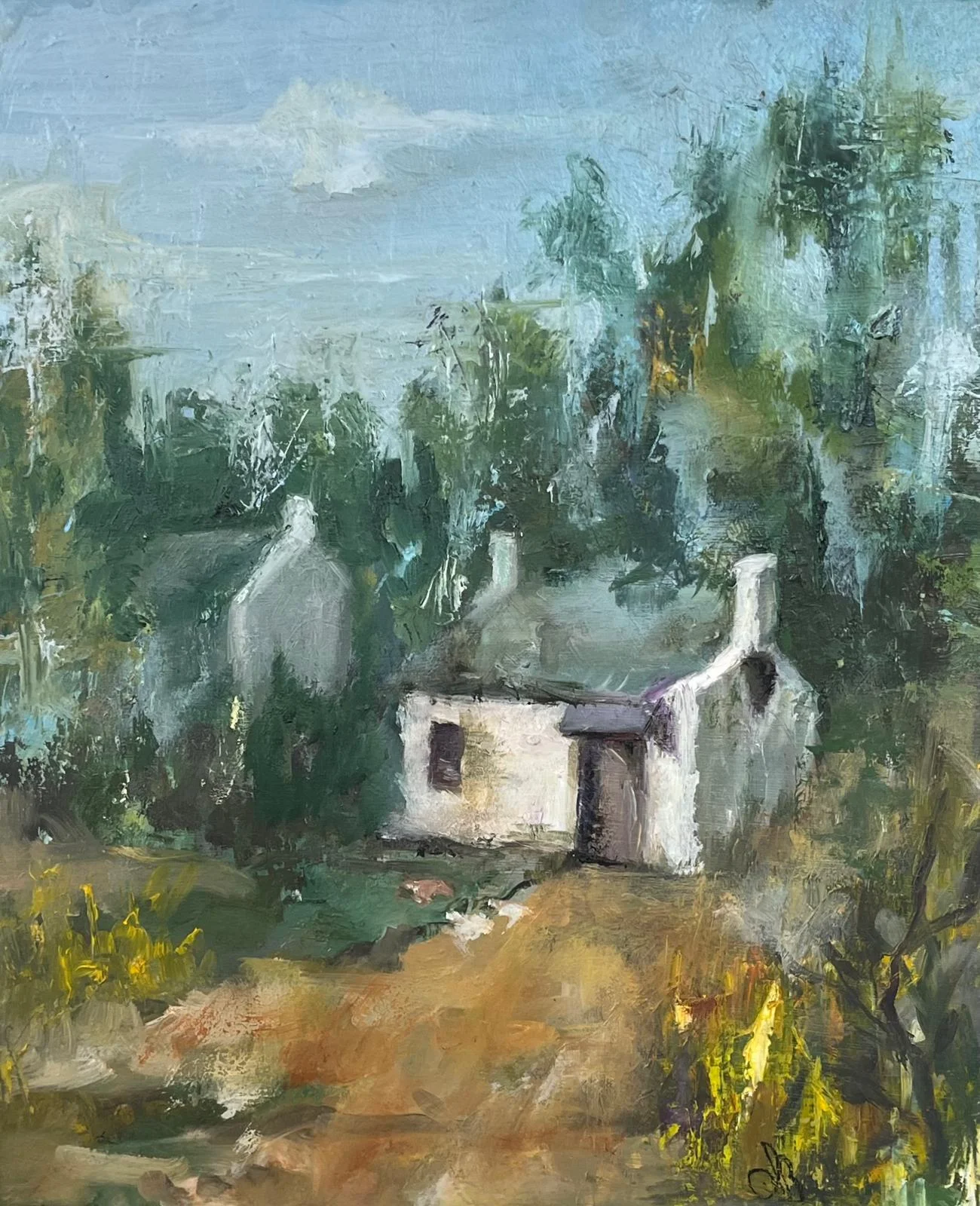 An atmospheric impressionist landscape depicting a secluded cabin nestled among lush trees, rendered with expressive brushwork and a soft, muted palette that evokes quiet rural serenity.