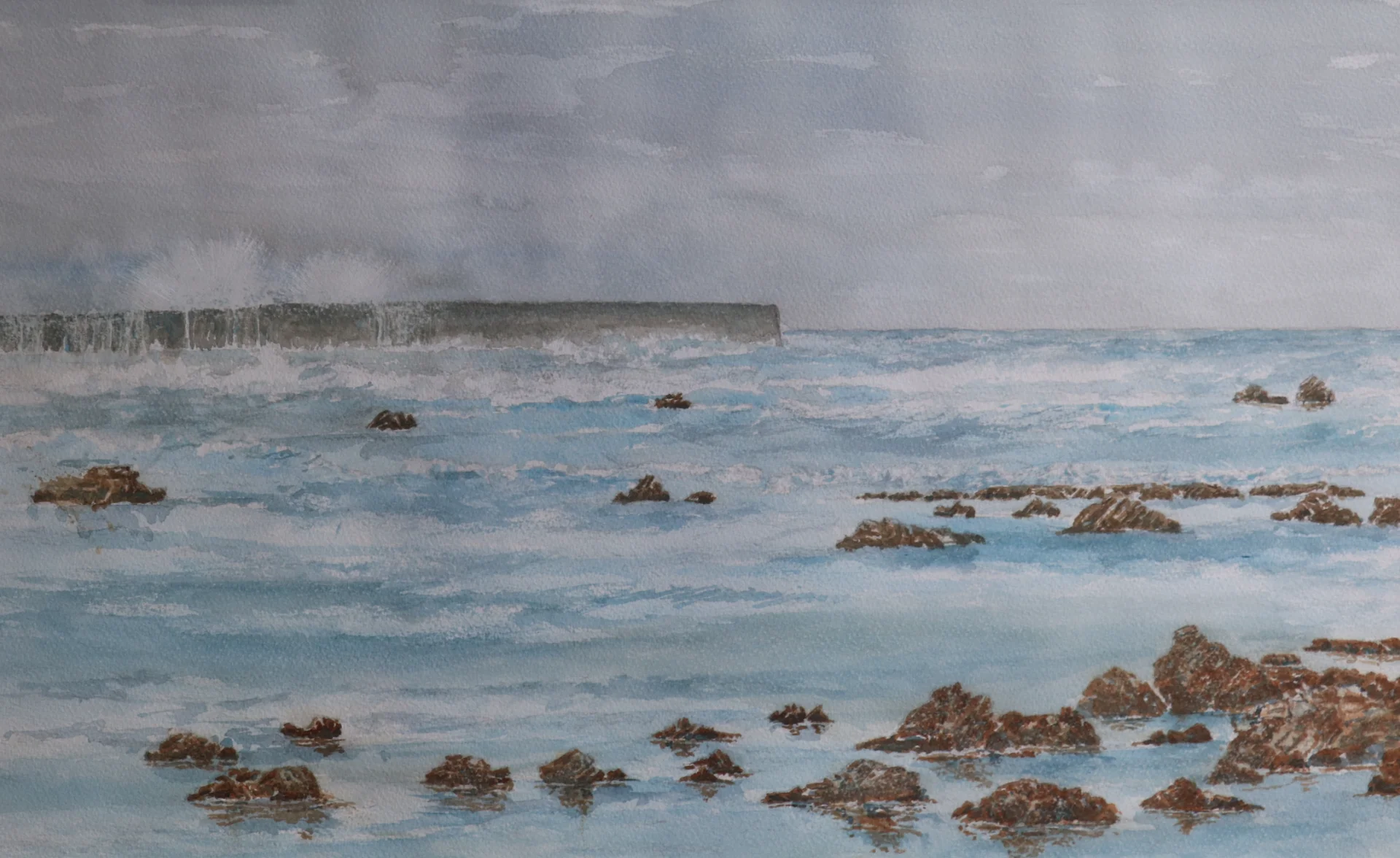 Watercolor painting on paper of waves crashing on the breakwater of the ancient harbor of Caesarea.