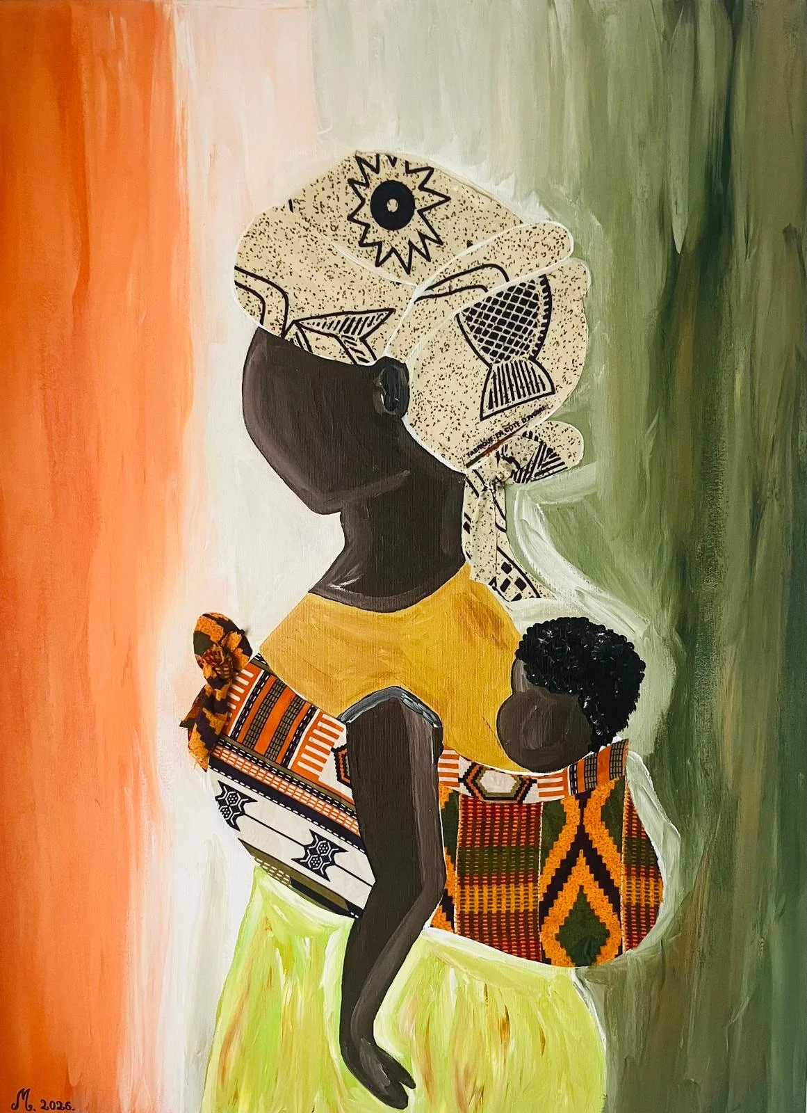 Carrying Home is a deeply personal work rooted in memory, identity, and motherhood. Inspired by my origins in Côte d’Ivoire, the piece incorporates the colors of the Ivorian flag alongside traditional African fabrics, grounding the composition in cultural heritage. The figure carries her child close—both literally and symbolically—holding onto a sense of home, history, and belonging. Through soft gestures and textured layers, the work reflects the quiet strength of motherhood and the enduring connection to one’s roots. More than a portrait, it is a tribute to where I come from—and what I carry with me.