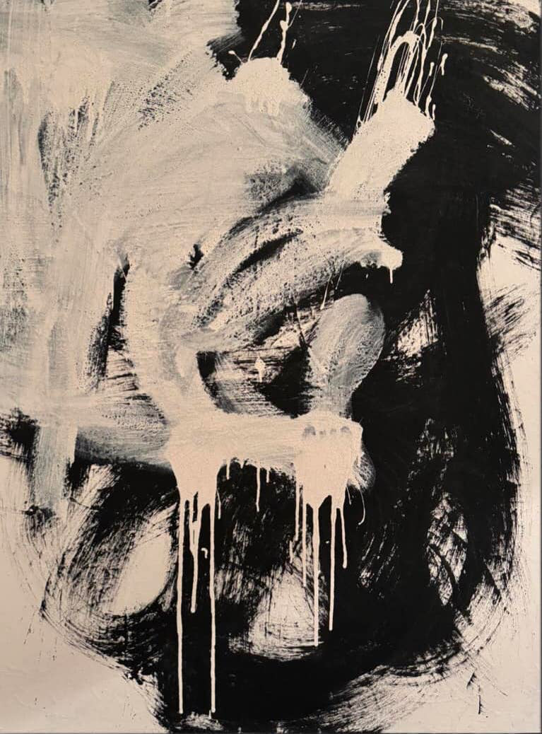 The painting explores the duality of light and shadow, order and chaos. The minimalist black-and-white palette doesn't restrict the artist, but rather reveals the structure of the gesture. The massive, dark forms evoke tectonic shifts or the outlines of rocks through which light shines. The work invites the viewer to meditate on the endless struggle and unity of opposites.