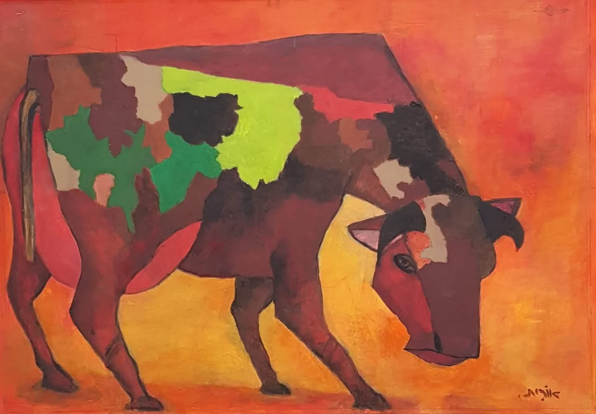 The painting "Cow" was painted inspired by Uri Reizman's painting Red Cow (from the Israeli art collection of the Mishkan Museum of Art, Ein Harod) with reference to the interpretation of the land and its fertility. The cow in my painting is based on a map of the Jezreel Valley area, and according to the geographical division that was in the background of the map, the color spots and the figure of the cow were created