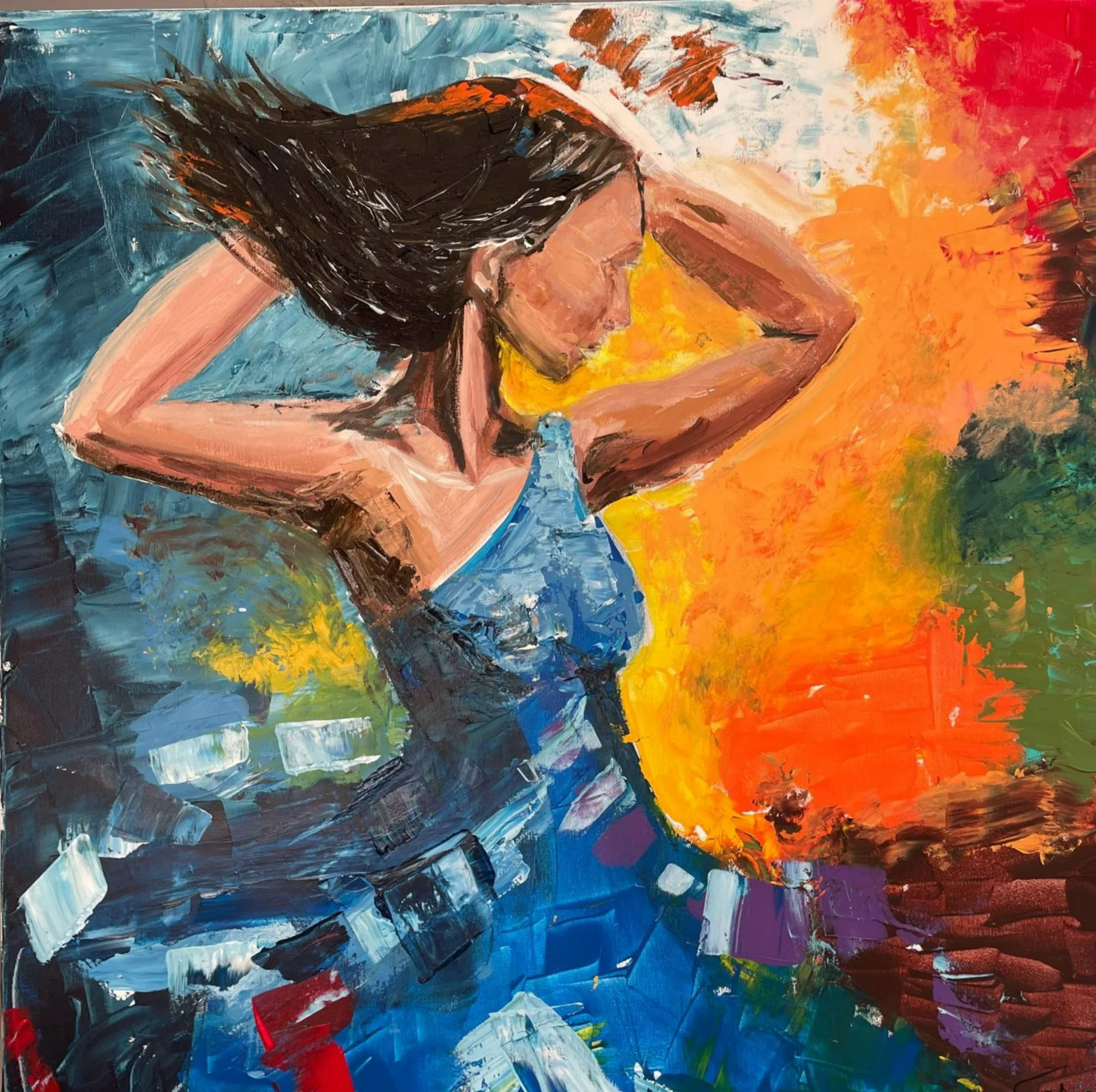 I am thrilled to present my new painting "Dancer," which is part of a series called "Women's Stories." This piece is created in a vibrant and dynamic style, reflecting my desire to capture the energy and strength of womanhood. I used acrylic paint because it allows me to create rich colors and deep textures, conveying a sense of movement and liveliness. In this work, I aimed to convey not just the outer beauty of the dancer, but also the emotions she experiences during her performance. Her long, flowing hair and light dress, full of movement, perfectly reflect her inner freedom and passion. I drew inspiration from the rhythm and dynamism found in dance performances, trying to capture that fleeting moment in my painting. The background, filled with bright shades of red and orange, transitioning into calmer blues and greens, symbolizes the multitude of emotions that women experience in their lives. It creates a contrast between the energy of the dance and the inner world of the dancer. I hope that viewers, when looking at this painting, can feel the same spirit of freedom and passion that inspired me during its creation.