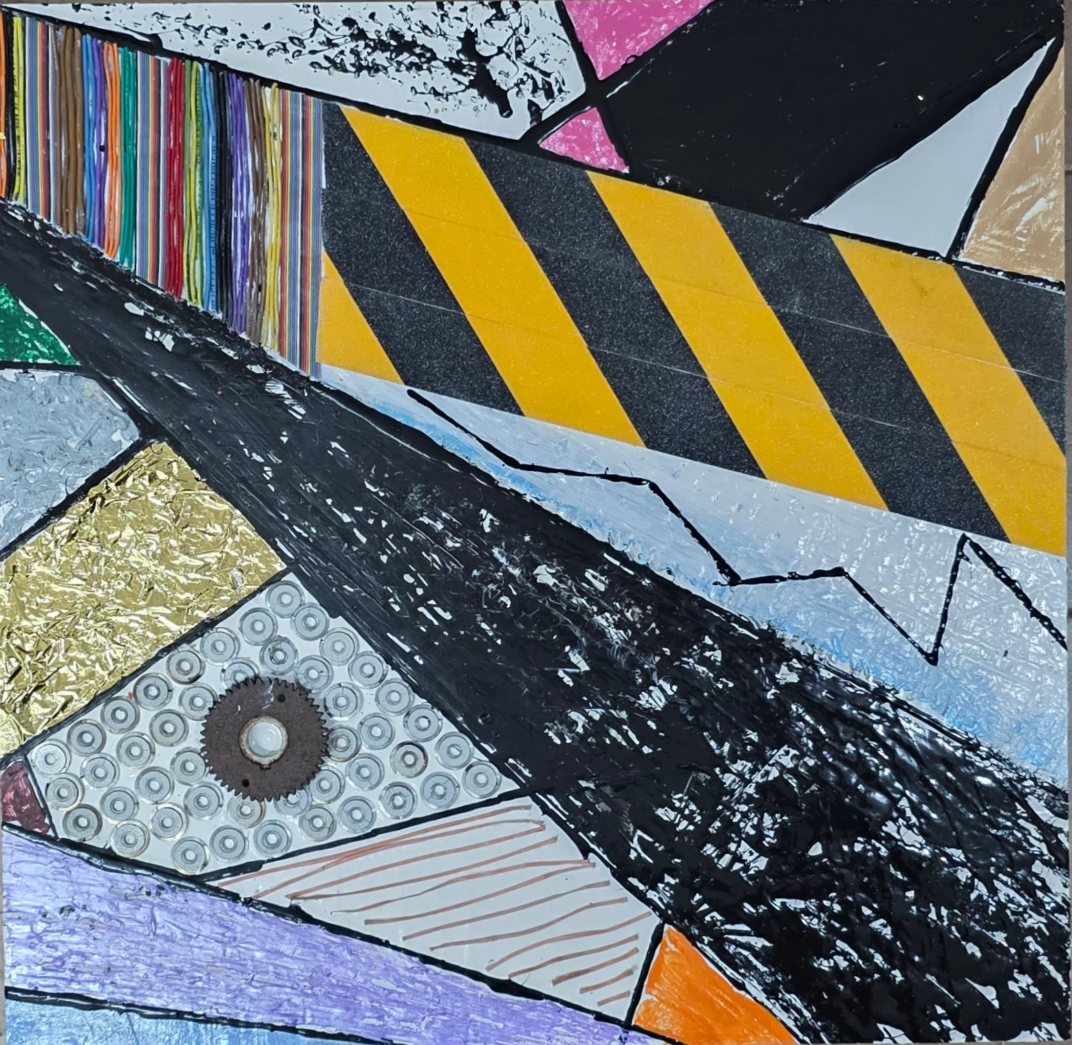 A work on birch wood combines industrial materials and colors, creating a special harmony that unites the understanding of the viewer's perspective with the work.