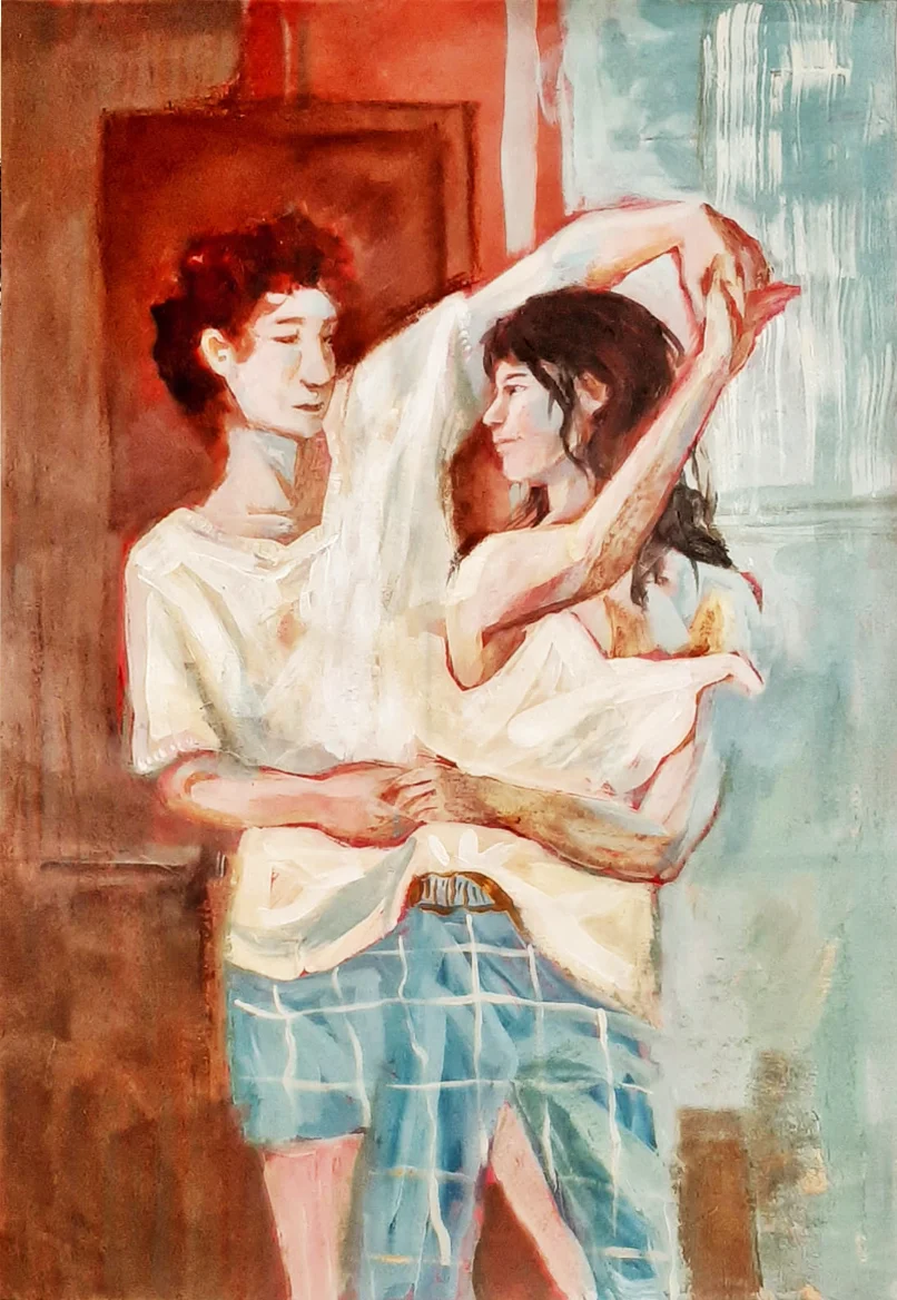 A figurative painting in soft, domestic tones of light blue and brown, depicting a young couple dressed in loose sleepwear, immersed in a warm and intimate dance. Their movement feels gentle and natural, as if emerging from the quiet rhythm of everyday life into a moment of closeness. Their garments merge into one another, almost as if they are wearing a shared piece of clothing, emphasizing their connection and unity. Boundaries dissolve as the figures move together as one. Inspired by life in a relationship during times of war, the painting offers a moment of love that exists beyond circumstance- a private space where intimacy endures despite the turbulence of the outside world.