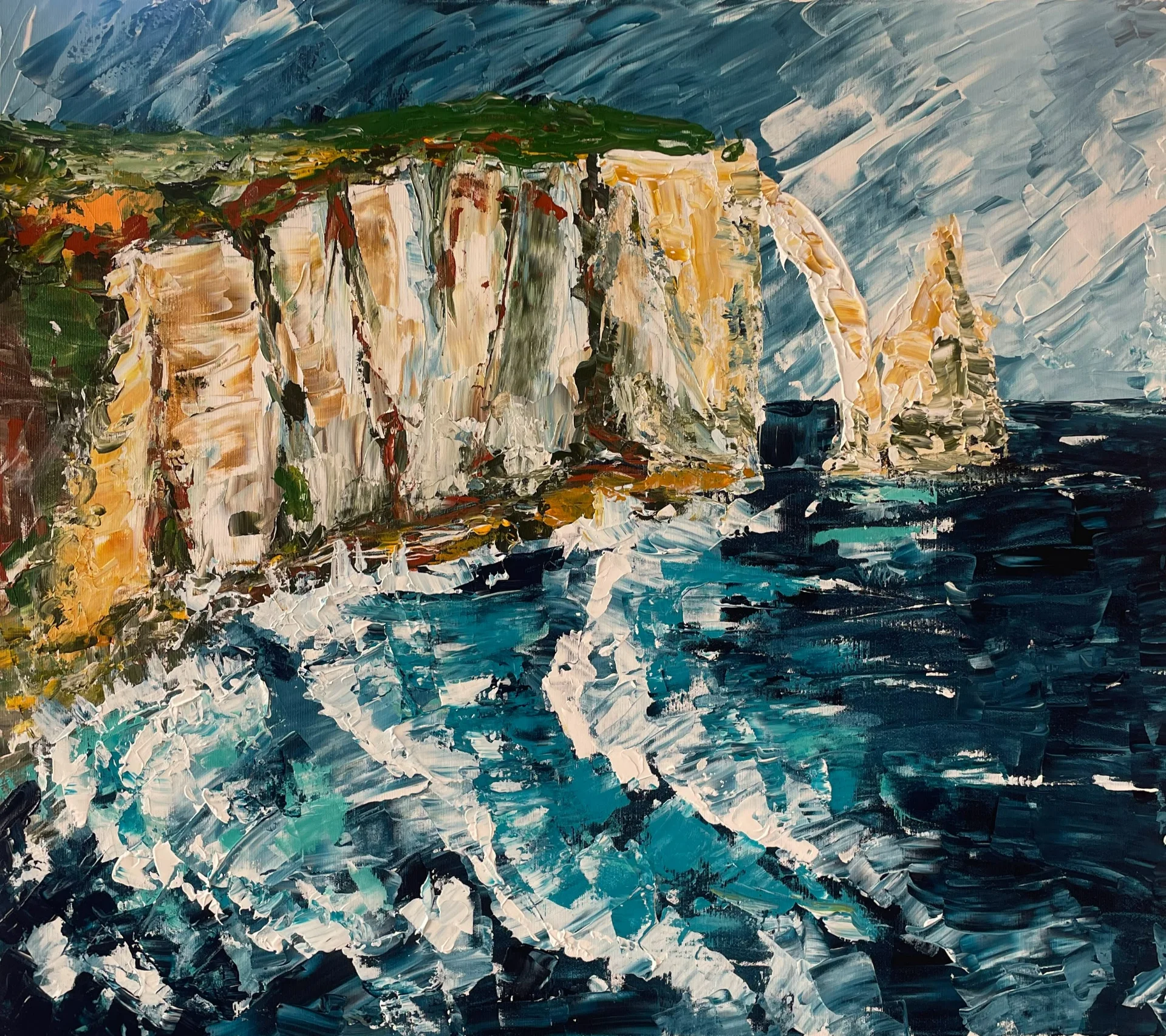 I am pleased to present my new painting "Etretat Cliffs," created with acrylic on canvas. This work is done in an impressionistic style, allowing me to convey movement and texture through thick, vibrant brushstrokes. In my effort to capture the grandeur of nature, I used rich earth tones—beige, brown, and green—to depict the massive cliffs that contrast with the deep blues and turquoise hues of the churning sea. At the heart of the composition is a natural rock arch—a symbol of the strength and beauty of nature, proudly standing over the dynamic ocean below. The sky, painted in cooler shades with streaks of blue and gray, adds atmosphere, creating a sense of a windy, overcast day. I was inspired to create this painting by the relentless power and beauty of the coastal landscape of Etretat. I aimed to capture not just the physical appearance of this place but also its emotional atmosphere. I wanted every viewer to feel the interaction between land and sea that has shaped these majestic cliffs over the centuries. This work is my homage to the living nature, its contrasts, and vulnerabilities. I hope it will immerse you in a world of seascapes and reflections on the eternal.