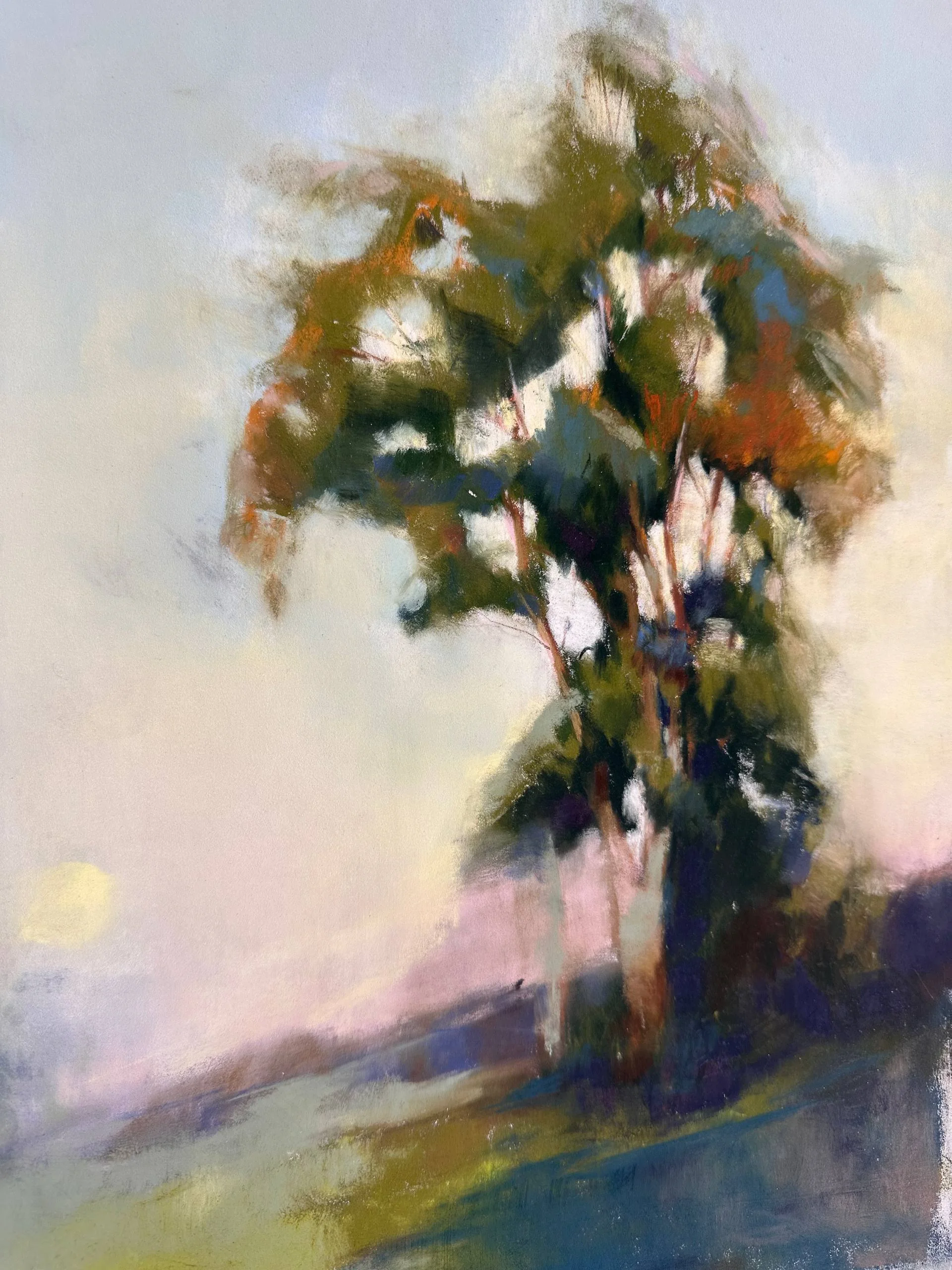 A pastel painting featuring a solitary eucalyptus tree against a pink and purple sky. The piece is based on the bold contrast between the dark tones of the tree and the soft, glowing light of the sunset. The raw color strokes and loose handling give this landscape a fresh, vibrant, and atmospheric feel.
