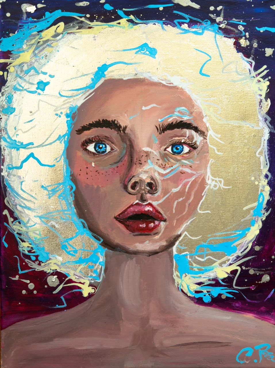 An expressive contemporary portrait of a woman with luminous silver-white hair, striking blue eyes, and bold facial features. Painted with dynamic brushwork and layered color contrasts, the work combines figurative painting with an energetic, almost surreal atmosphere.