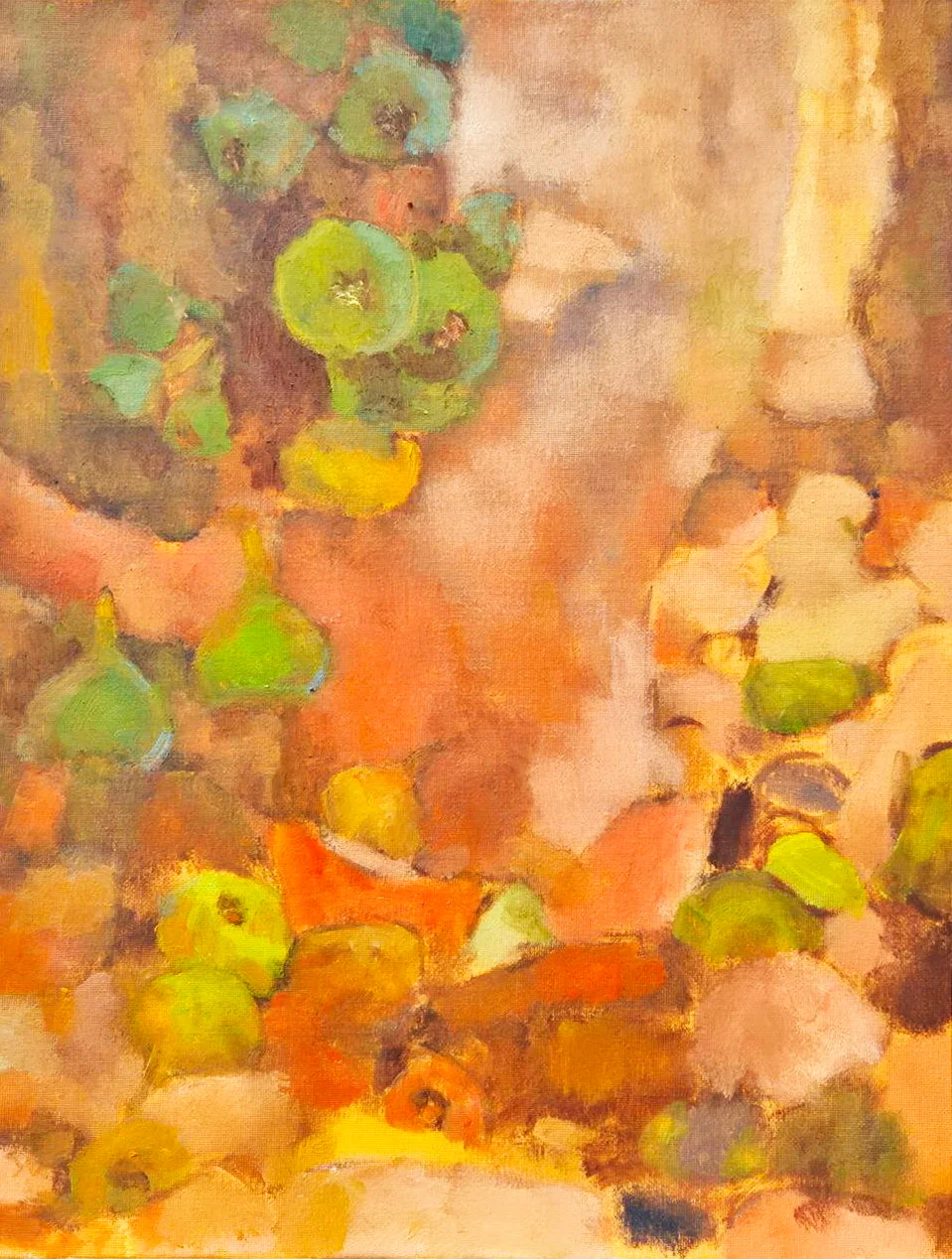 The artist employs a soft, impressionistic style where forms eschew rigid boundaries, flowing gracefully into one another. The rich texture of the brushstrokes and the classical layering of oil painting lend the canvas depth and an inner luminosity. • Mood: Serenity, Mediterranean warmth, and the organic beauty of life. • Color Palette: A harmony of warm earthy tones balanced by refreshing accents of young greenery. • Concept: This painting serves as a reminder of life's simple joys and the beauty of a moment when time seems to stand still under the midday sun.