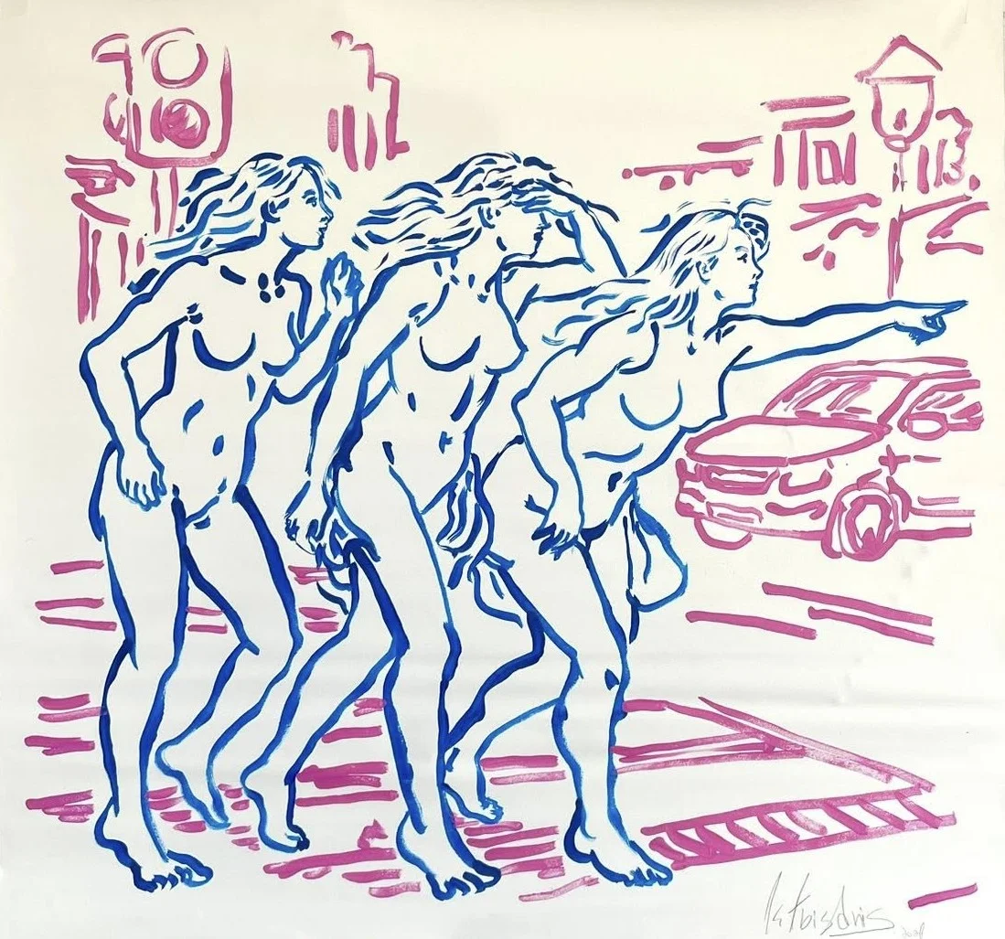 In the piece "First Time in the City- Crosswalk", Abisdris offers a vibrant, contemporary interpretation of the initial encounter with the urban sphere. Utilizing a minimal palette of blue and pink with a spontaneous,expressive line, she places three figures within a bustling environment—suggested by a car and a traffic light. The work weaves together the raw immediacy of street culture with the visual languages of Pop Art and Modernism, exploring the tension between the vulnerability of the body and the anonymity of the public space. It is a bold, self-aware piece reflecting on presence and visibility in today’s overstimulated visual reality.