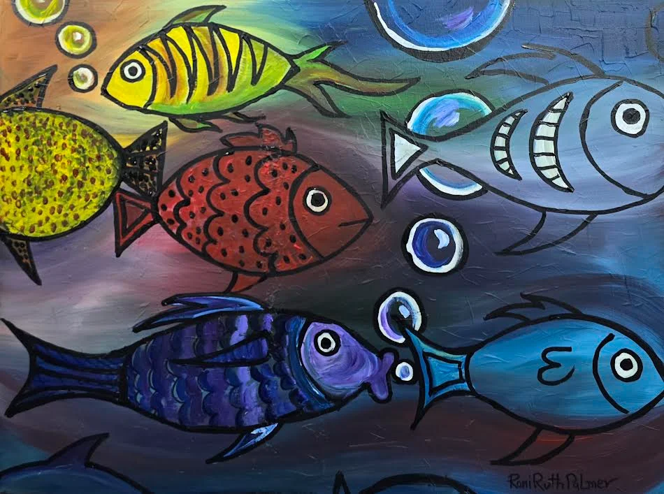 Original Colorful Fish Painting โ Modern Naรฏve Underwater Dive into a vibrant underwater dream filled with character, movement, and joyful imagination. This original artwork by Roni Ruth Palmer captures a whimsical school of fish, each with its own personality, swimming through a magical sea of color and light. Painted in bold, expressive strokes, the composition blends playful naรฏve style with modern abstract elements. Electric blues, deep purples, fiery reds, and luminous yellows dance across the canvas, creating depth and motion. The outlined fish forms, decorative patterns, and floating bubbles add charm and storytelling to the scene. โจ 100% Original Artwork โจ Hand-painted with professional-quality acrylics โจ Rich textures and visible brushwork โจ Signed by the artist โจ Stretched canvas on a wooden frame โ ready to hang This piece brings a sense of happiness, creativity, and positive energy to any space. Perfect for a living room, studio, childrenโs room, beach house, or anyone who loves color and expressive art. Let this joyful underwater world swim into your home and spark conversation, imagination, and warmth every single day. ๐๐