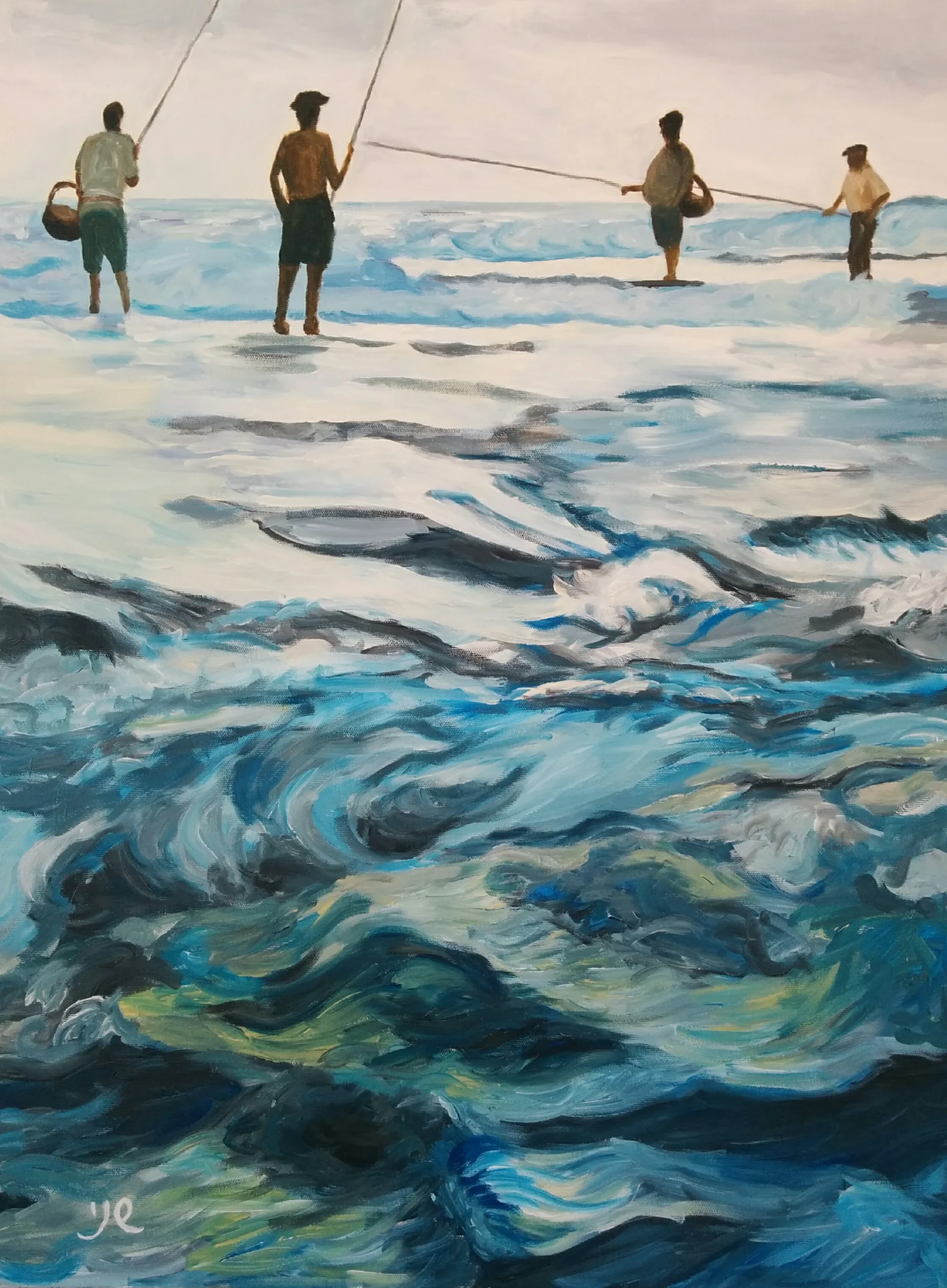 An atmospheric seascape depicting fishermen standing in the surf at Bat Galim Beach in Haifa. Painted with expressive brushwork and dynamic movement, the work captures the shifting light, the energy of the Mediterranean waves, and the quiet rhythm of coastal life.