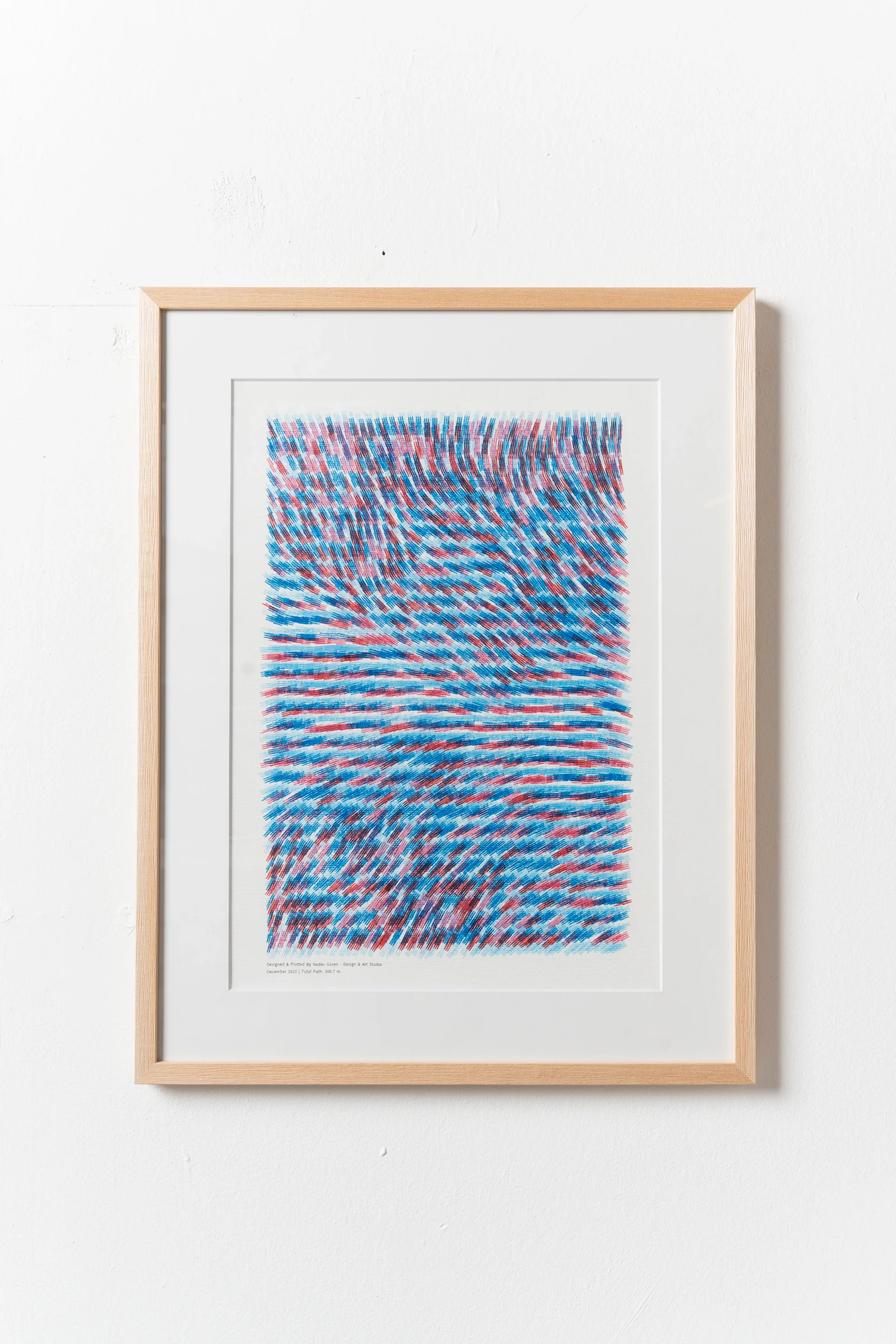היצירה חוקרת תנועה אורגנית מתוך מערכת חוקים מתמטית. זרימת הקווים, המדמה זרמי אוויר או טופוגרפיה משתנה, מושפעת על ידי מניפולציות גאומטריות שיוצרות מתח בין הסדר האלגוריתמי לבין המקריות של החומר. היצירה מבוססת קוד ונוצרה באמצעות Flow Field Equations. בניגוד להדפסה דיגיטלית סטנדרטית, יצירה זו נרשמה פיזית על ידי Pen Plotter, היא מורכבת מ-4 שכבות של Fine Liners 0.5mm, ונוצרה בתהליך שנמשך כ-4 שעות עבודה רצופות של המכונה. הטכניקה כוללת Overprint - בנייה של שכבות דיו מצטברות על הנייר, המעניקות לעבודה עומק וטקסטורה שלא ניתן לשחזר בשום אמצעי דיגיטלי אחר. העבודה מגיעה בתצורה ממסוגרת או שטוחה - המידות מתייחסות לעבודה ממסוגרת. מידות ההדפס עצמו - 42X30 ס״מ (A3).