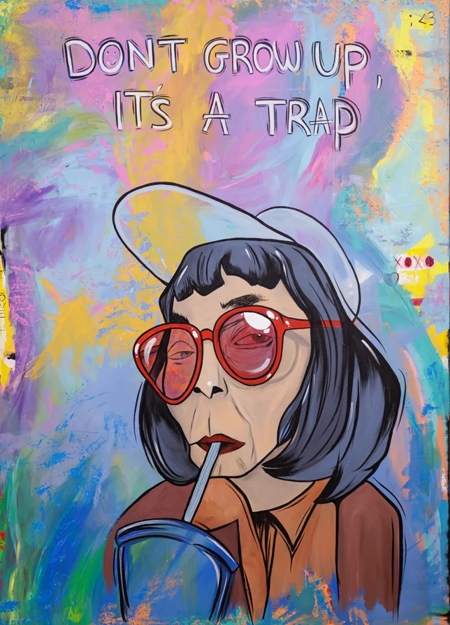 A cheeky wink at a world that never quite grows up. A mix of innocence, attitude, and bold color creates an unapologetic character.