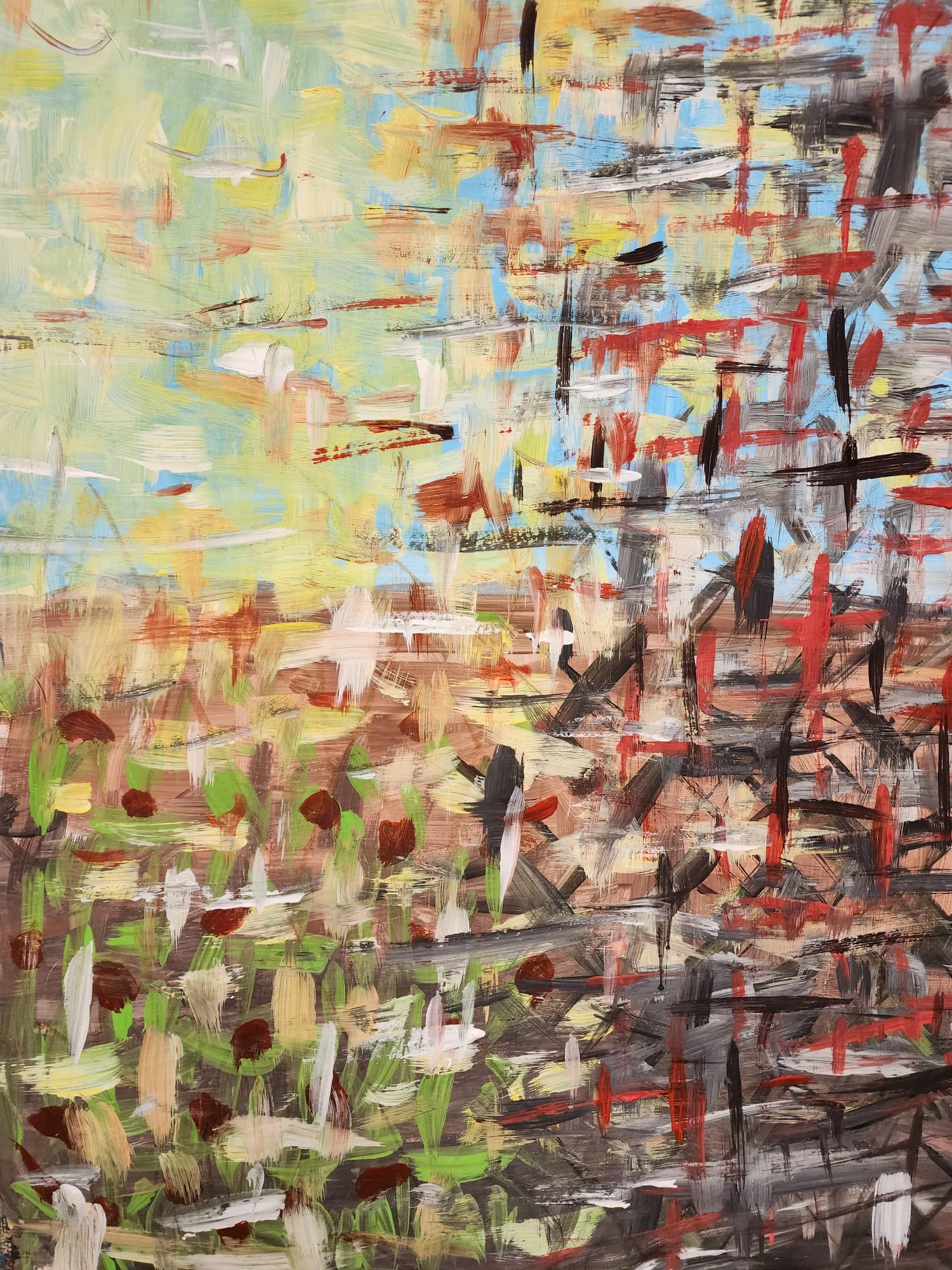 A field of layered gestures moves from dense, dark zones into lighter, open space. Crossing marks suggest tension and motion. The painting embodies a passage through struggle toward possibility.