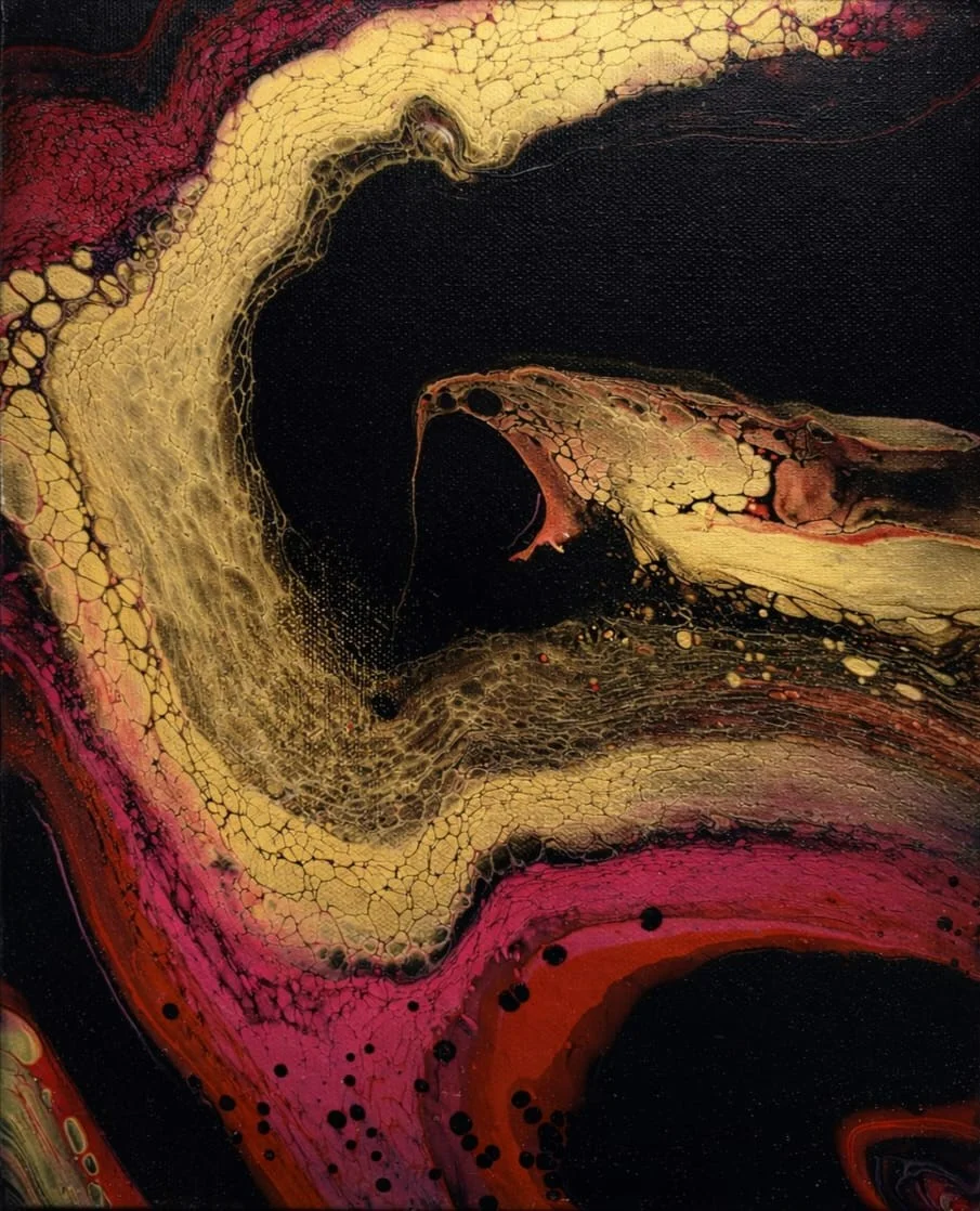 From currents of black and rivers of gold, a serpentine presence emerges to guard a hidden passage. Living cells and burning reds create tension, mystery, and revelation. The closer you look, the more the story unfolds.
