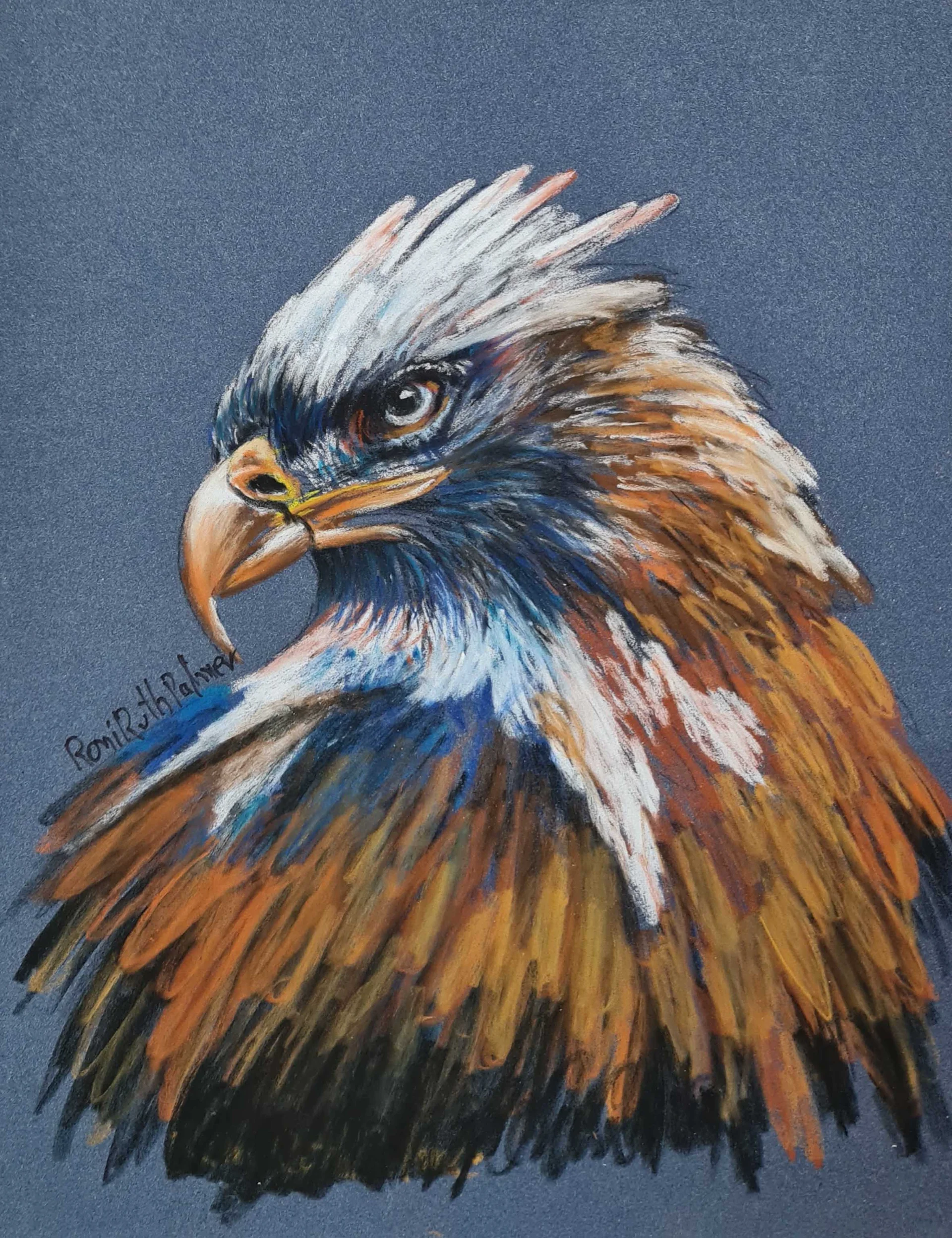An original and powerful painting depicting a noble bird of prey with a sharp gaze and full of presence. A spectacular combination of shades of deep blue, white, gold and brown creates a sense of movement and life within its impressive feathers. The work exudes freedom, strength and intelligence, and manages to capture a moment of dramatic silence before flight. This is a painting with a unique character and impressive presence, suitable for a space that seeks inspiration, power and natural beauty.
