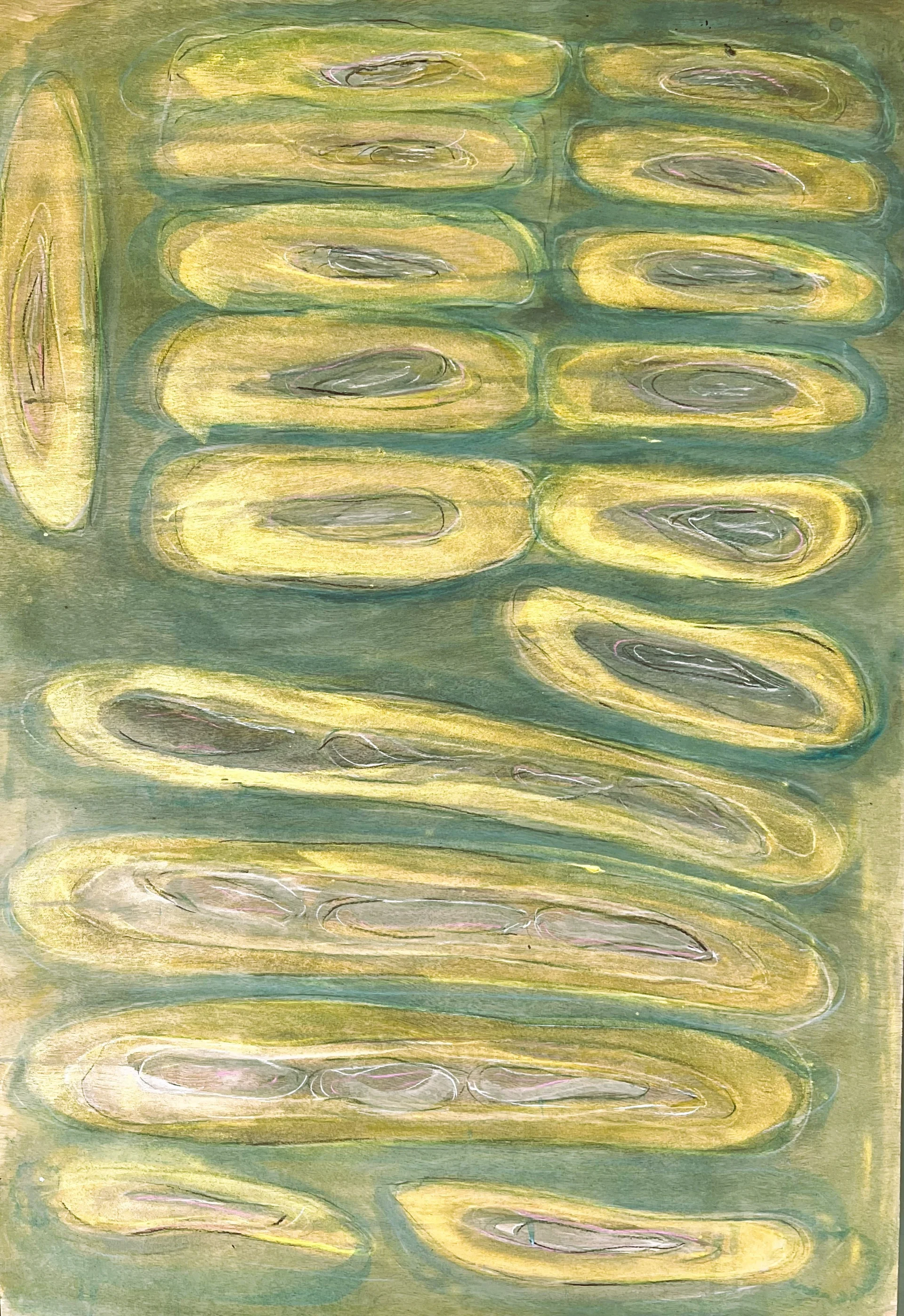 Elliptical forms float in a bluish-green sea. The graduated arrangement creates a soothing rhythm, an endless flow through space, and a calming sense of movement. painting on wood