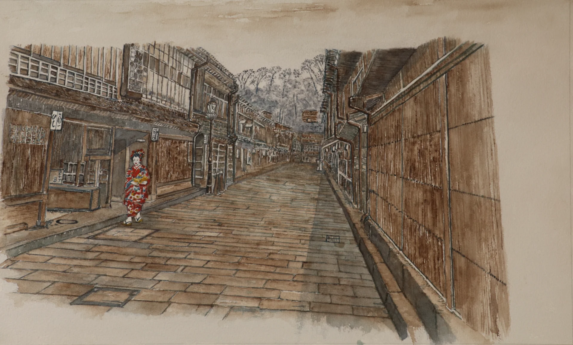 Watercolor painting on paper of a Japanese miko walking down a street that preserves tradition.