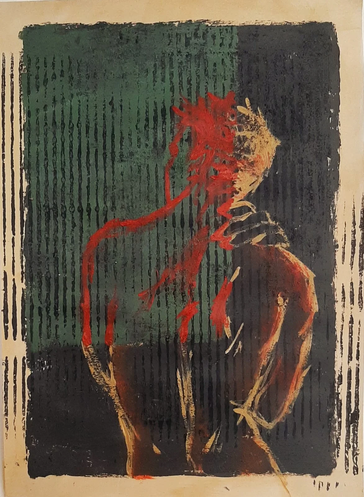 An expressive figurative work in deep earth tones, portraying the back of a solitary figure holding his own shoulder in a gesture of self-support and containment. Built through rough contours, layered textures, and a fragmented abstract background, the composition explores vulnerability, resilience, and the human need to create belonging from within. The contrast between the unstable surface and the intimate bodily gesture gives the work emotional tension and presence.