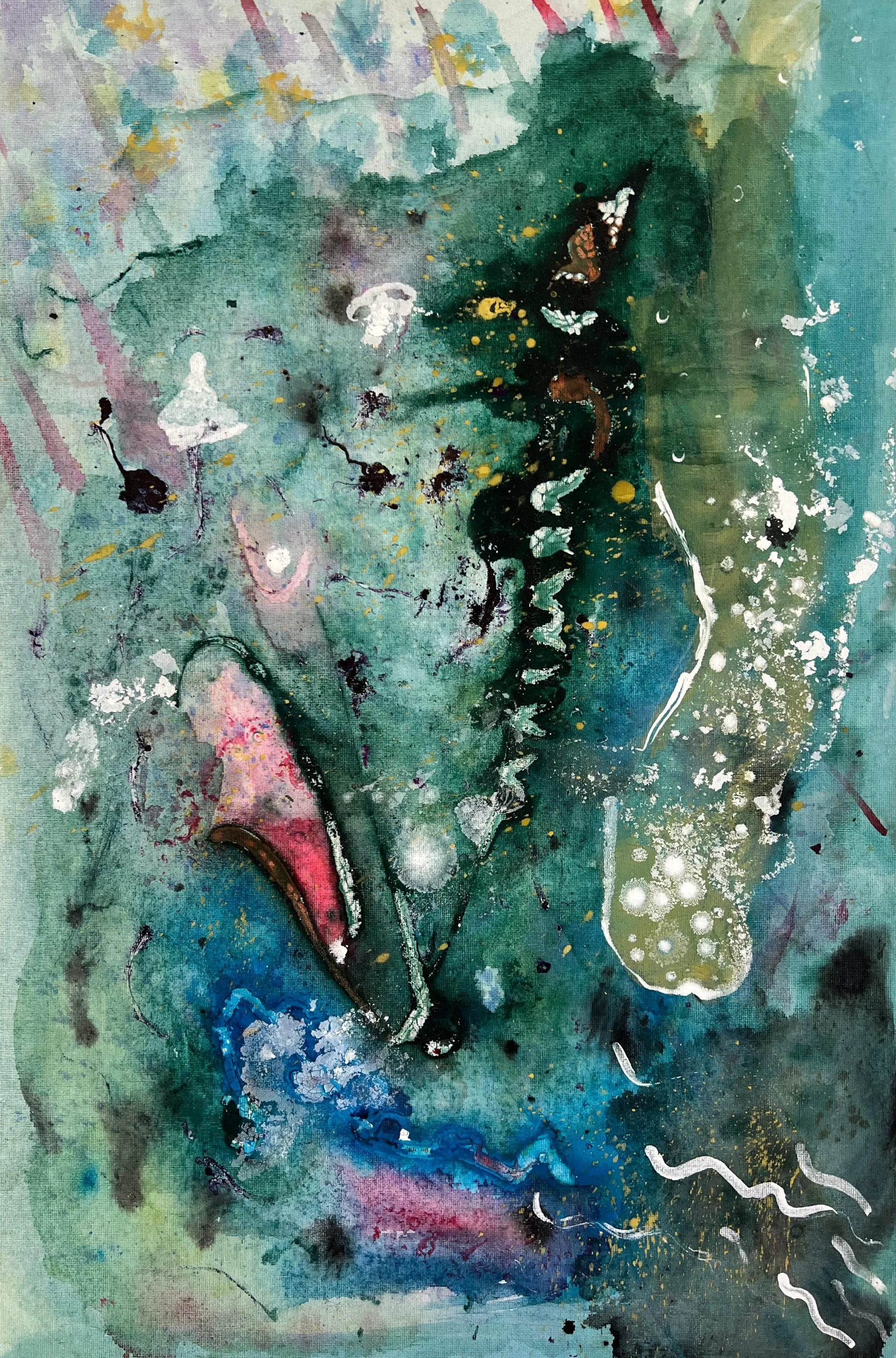 A playful combination of water color and different types of ink on canvas